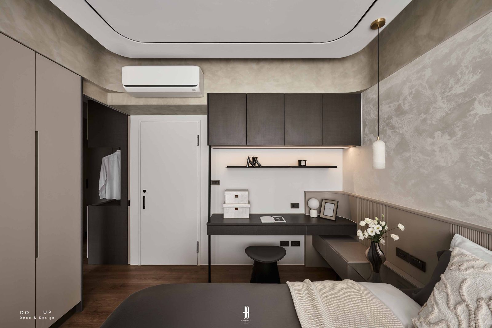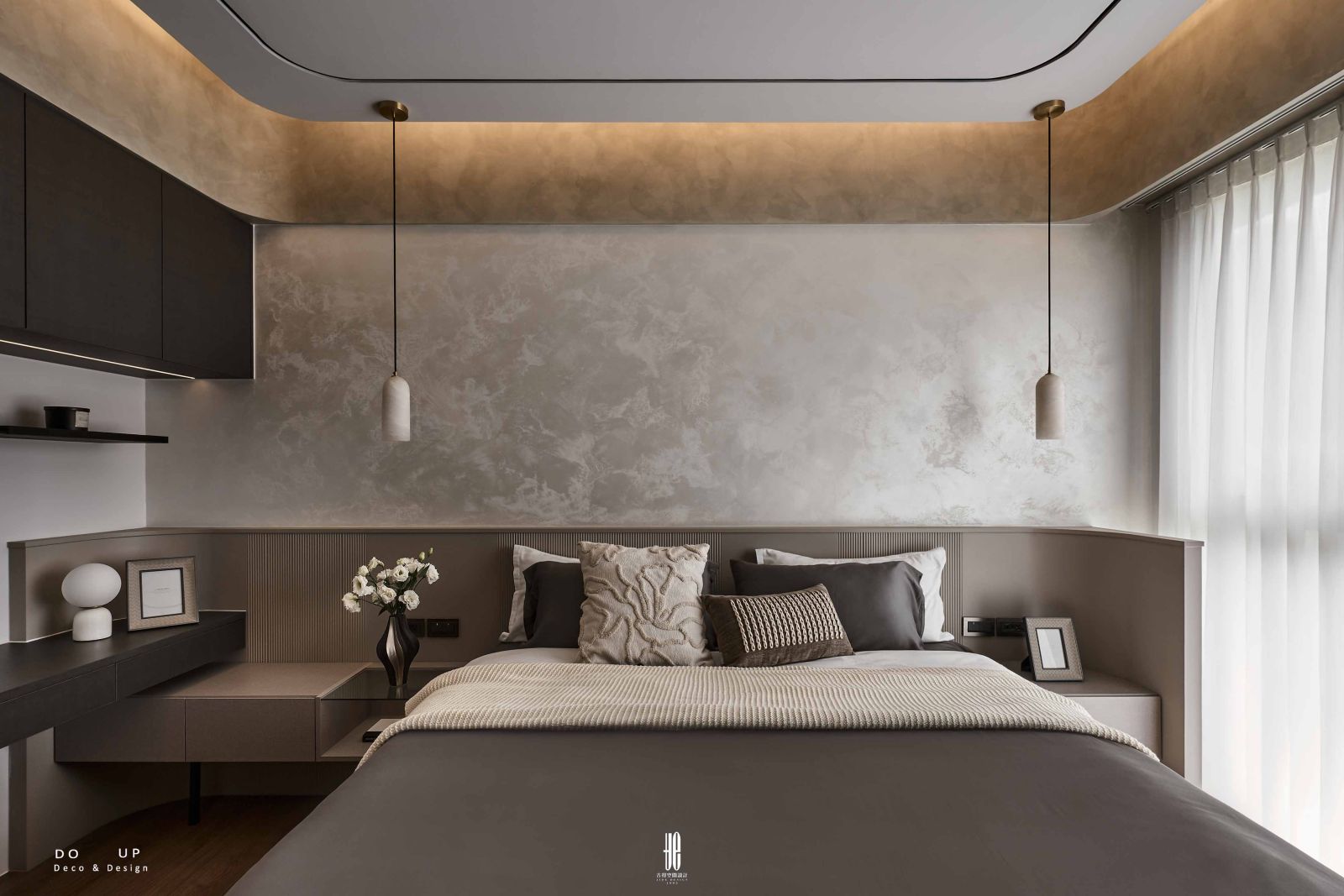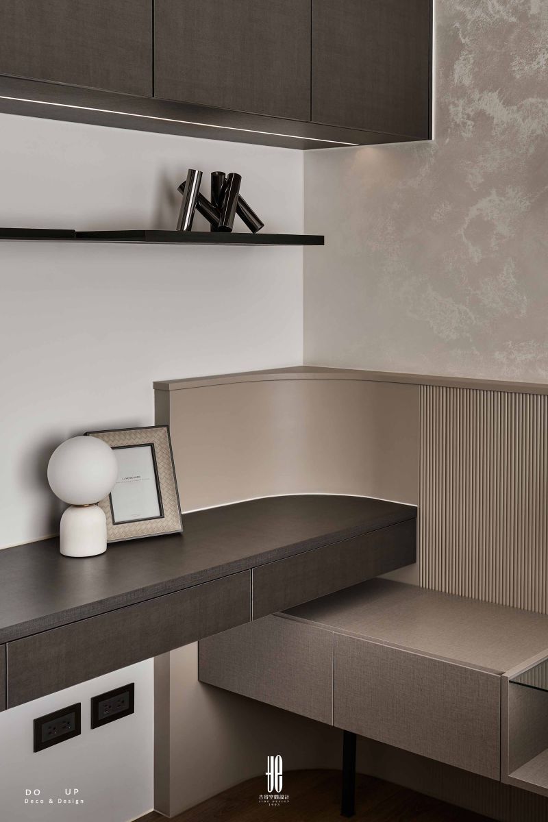 DO UP 此處致力於編織一份安穩的「幽然氣韻」。我們選用低彩度的灰褐、墨棕織品與床上的米色針織毯相互層疊, 透過異材質的肌理對比,平衡了塗料的冷冽感。床頭櫃上的藝術擺飾與具雕塑感的白色燈飾, 在深色背牆前勾勒出鮮明的輪廓,將DECO物件轉化為安放心靈的藝術端景。