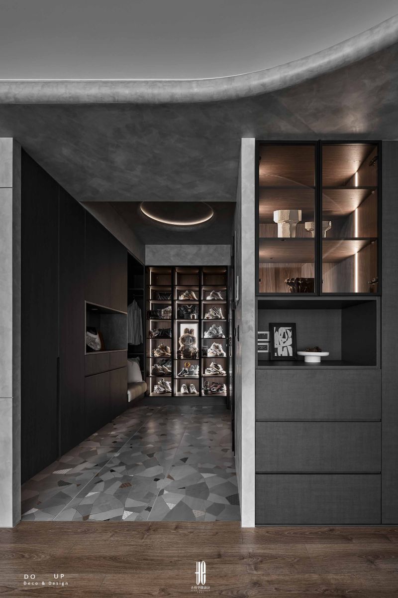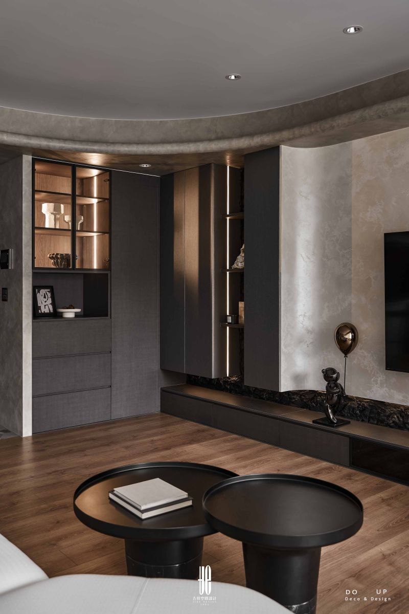 客廳的定錨,在於材質的對話。電視牆選用岩石漆處理的塗層紋理,化作弧線痕跡,與周遭的深色櫃體形成剛柔並濟的對比。DO UP深諳這種對比美學,雲朵造型沙發,成功成為墨色中的視覺留白;我們搭配兩張黑色圓形茶几,以線條的圓潤與色彩的深邃,穩定了視覺焦點。
