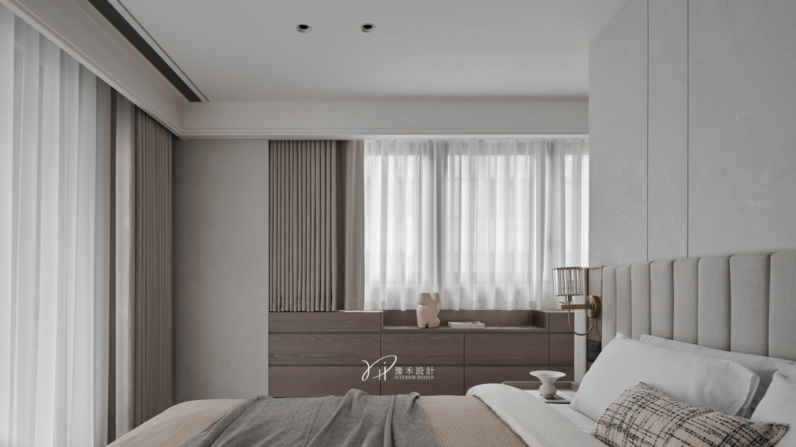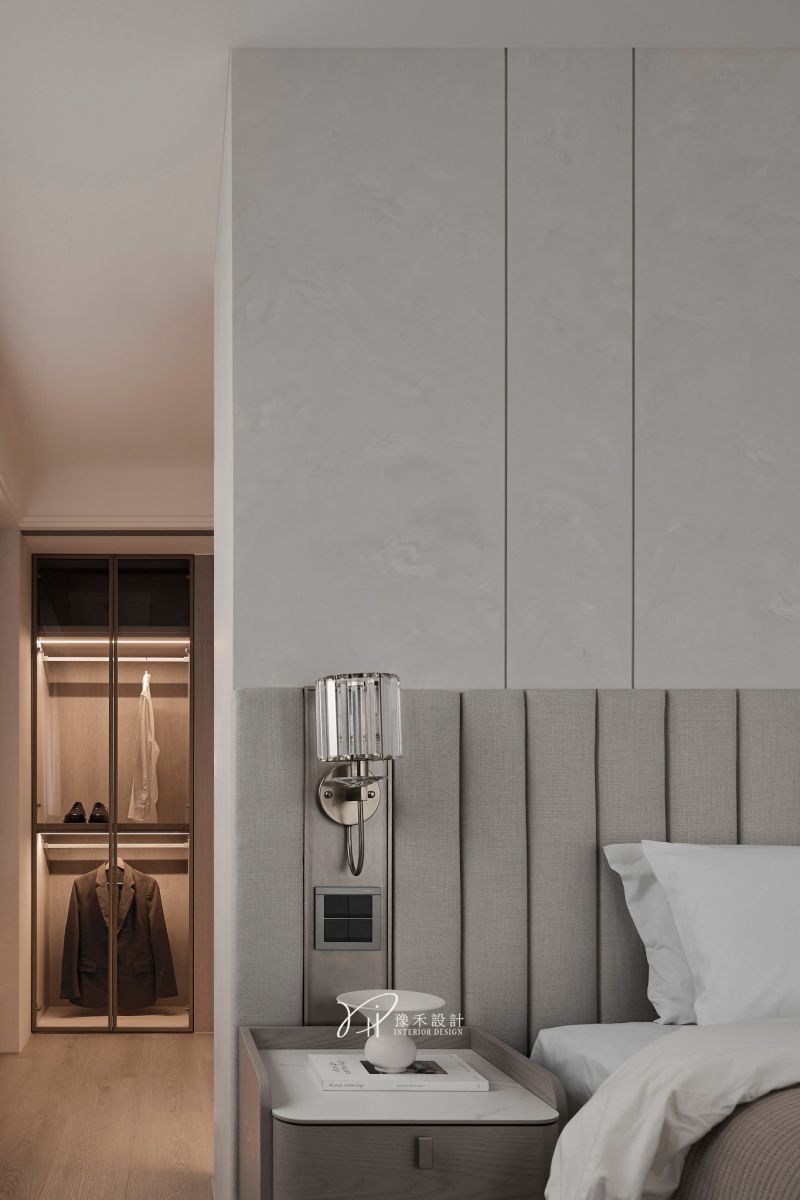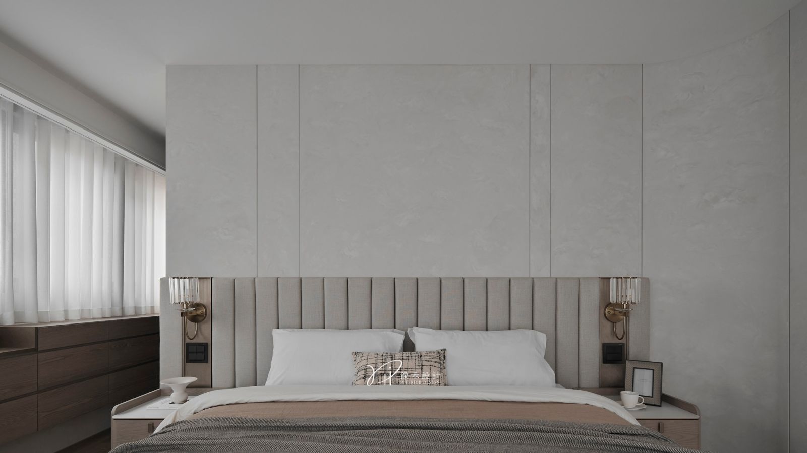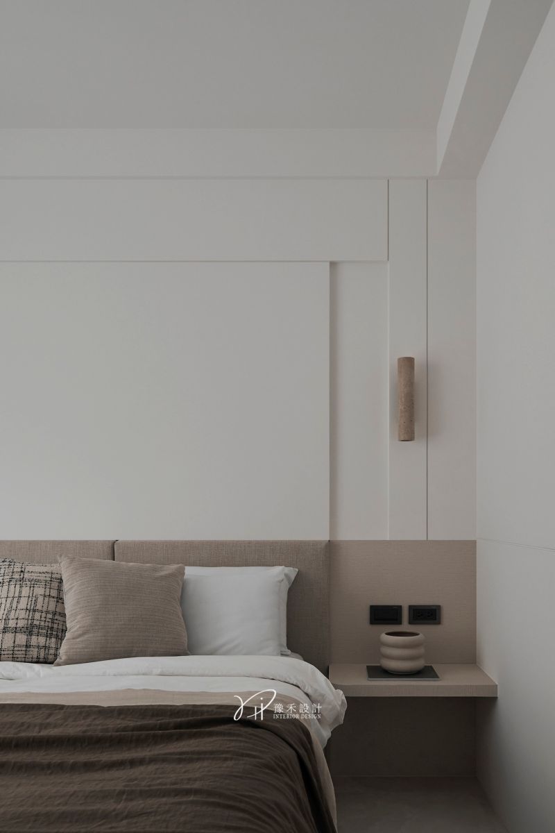 進到臥室空間是美好的雙面採光,室內設計師油漆選用有雲霧視覺質感的藝術漆,床區搭配米色繃布床頭與金屬拼接,是高級又溫暖的氛圍,擺拍師以簡約的床組配色與單一長型抱枕點綴,用最平凡的份量達到最不凡的妝點。
