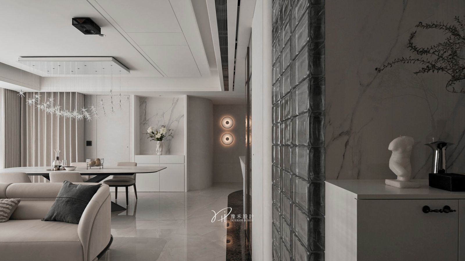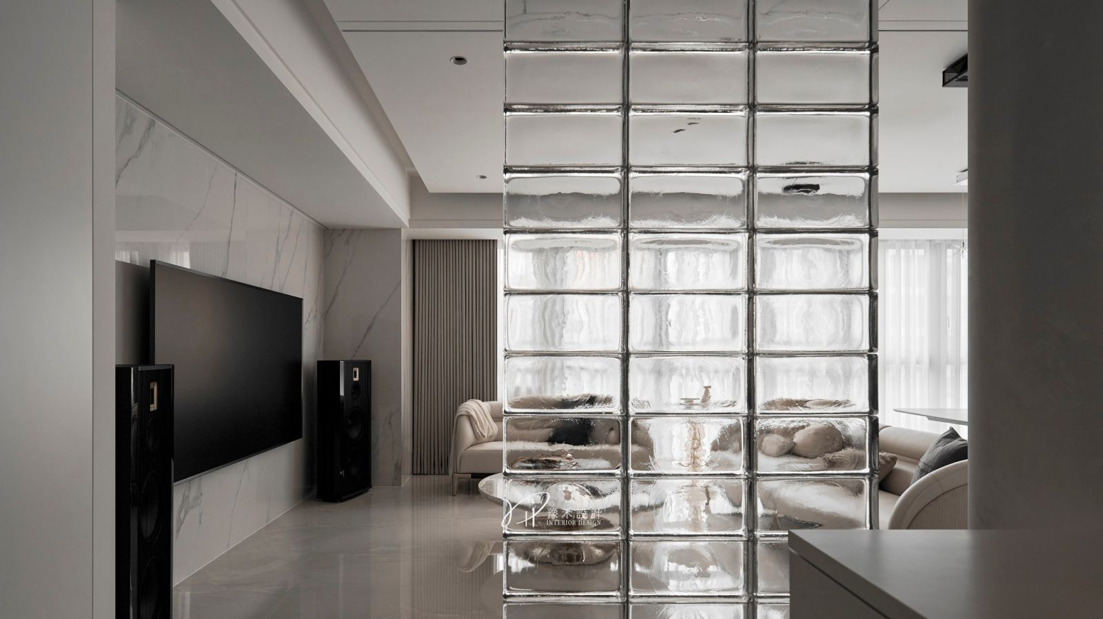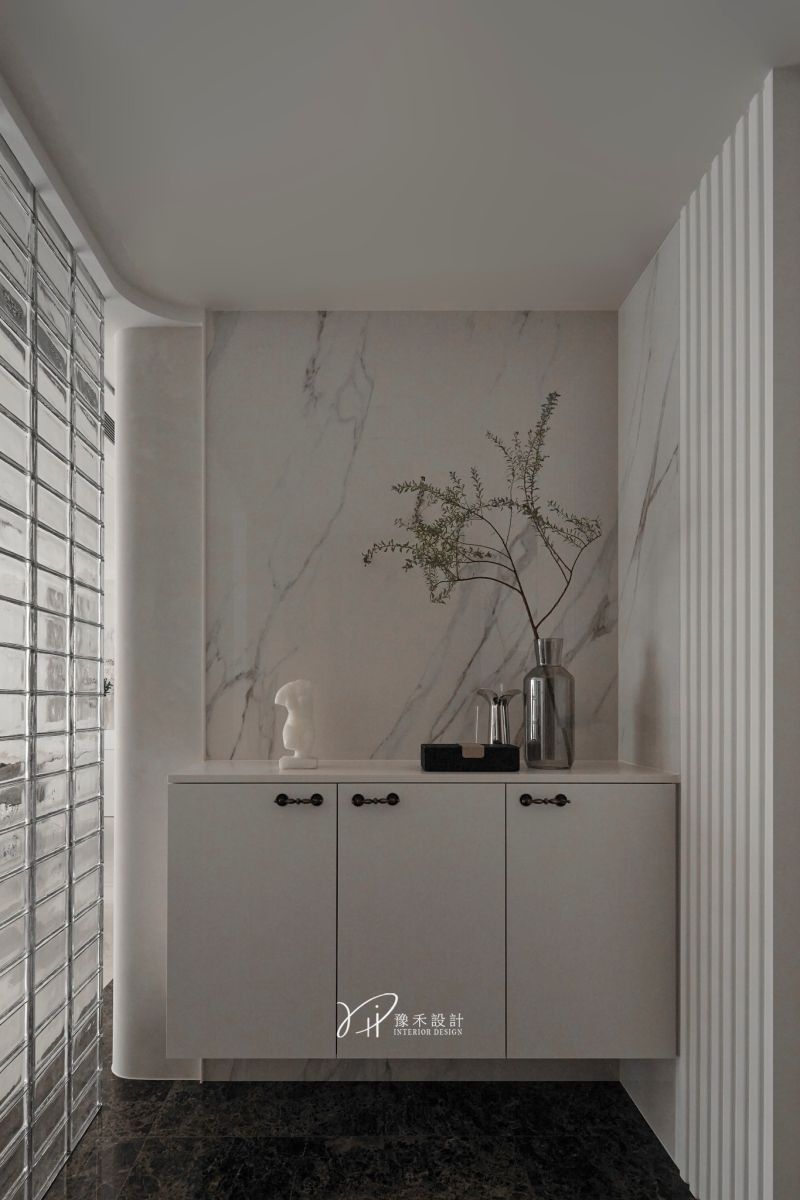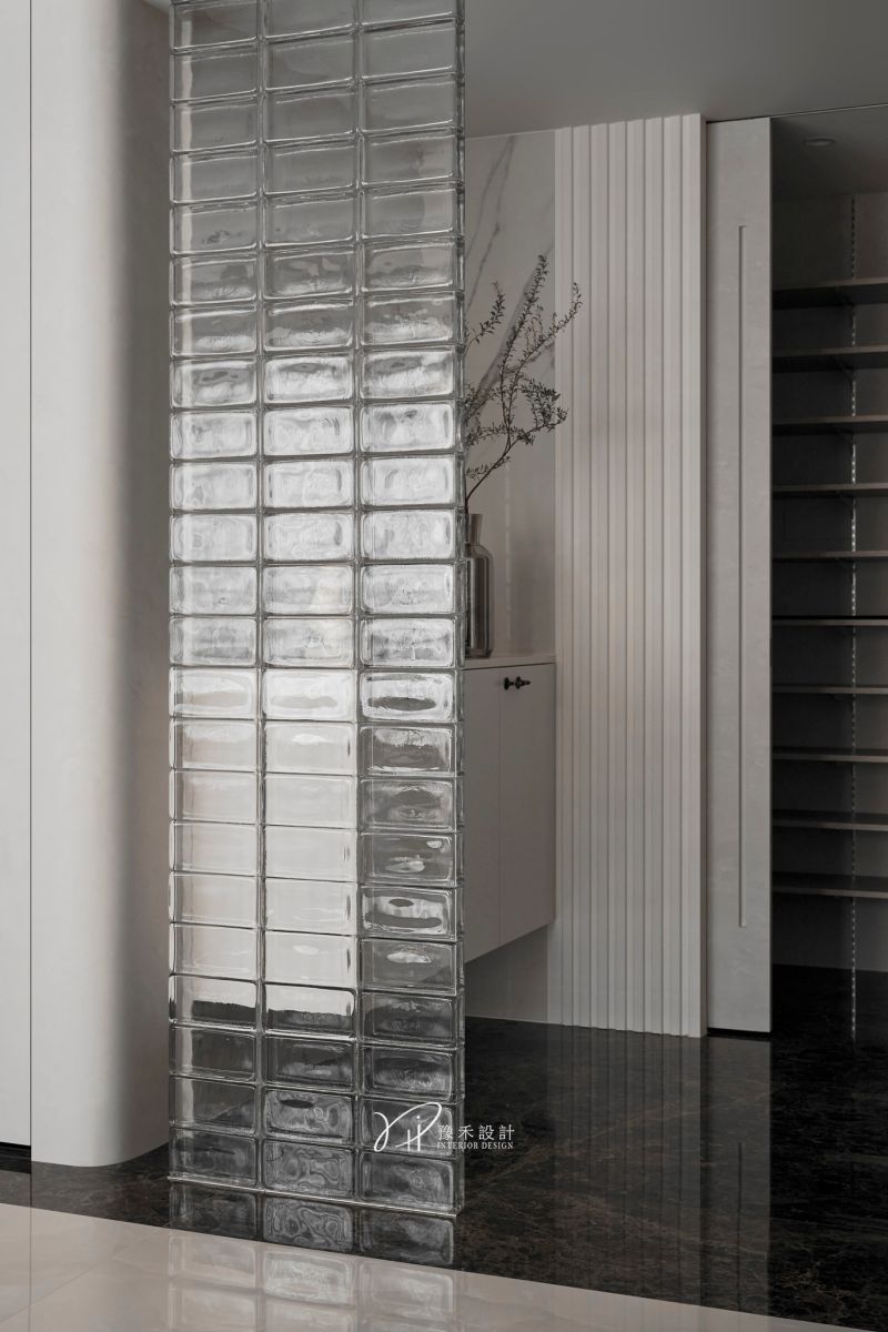 玄關區設計師用黑色的磁磚以及玻璃磚做出區隔,玻璃帶來的反光質感,搭配銀色玻璃花器做呼應,而大理石紋牆面的奢華感中,用黑色擺飾盒增加沈穩氛圍,加上流線雪柳、白色雕塑蠟燭,讓每一幕都是充滿細緻。