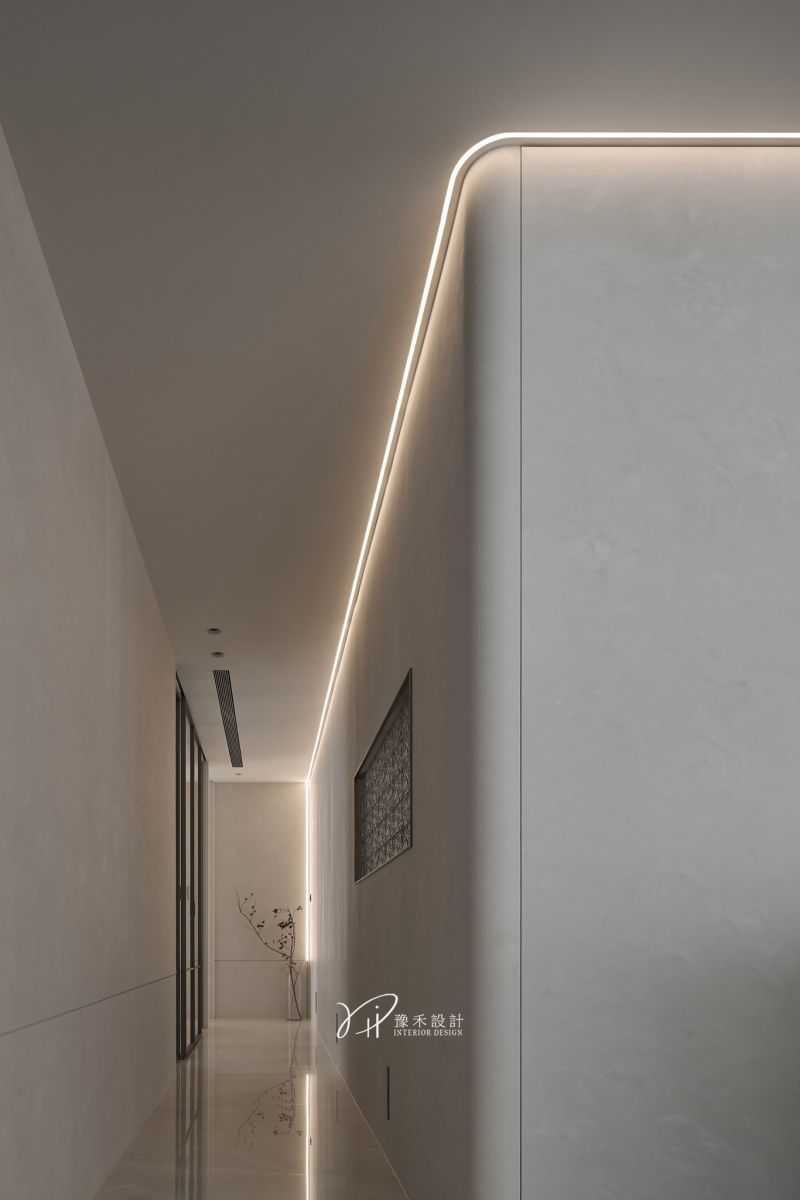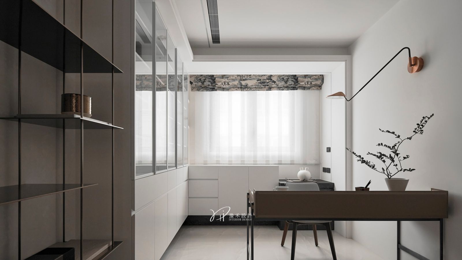 再前往書房與次臥的走道盡頭,擺拍設計師用大型落地透明直筒花瓶,插上流線木枝達到端景效果,靜靜的佇立,透過光線的設計與地板反射,形成另外一種隱約的美;書房空間俐落的線條設計,在前方的書桌用造型花器搭配線條特殊的枝葉,為空間帶來生氣,並將視覺延伸到壁燈,一旁的鐵件造型展示櫃,擺拍設計師用少量但精準得陳列飾品擺設,營造出文學、藝術的氛圍。
