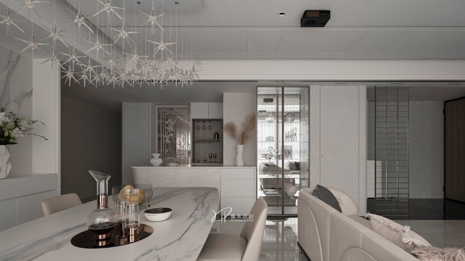 客餐廳的大器格局,沒有過度的裝修,室內設計師用精準的設計,格局、選材、燈光都不馬乎,擺拍設計師也不張揚的,用精準的選品擺飾來為空間加分,選擇玫瑰金、玻璃、白色點綴;不搶走吊燈的大器,在餐桌用造型的酒杯瓶、果盆增加氛圍,而將花器擺放在一旁的端景櫃,插上百合、流線型的枝條,讓視覺多增加一處重點,延續整體質感。