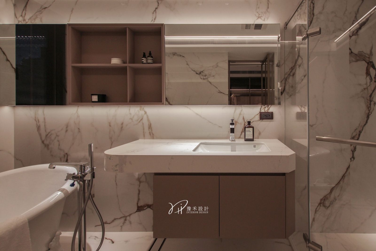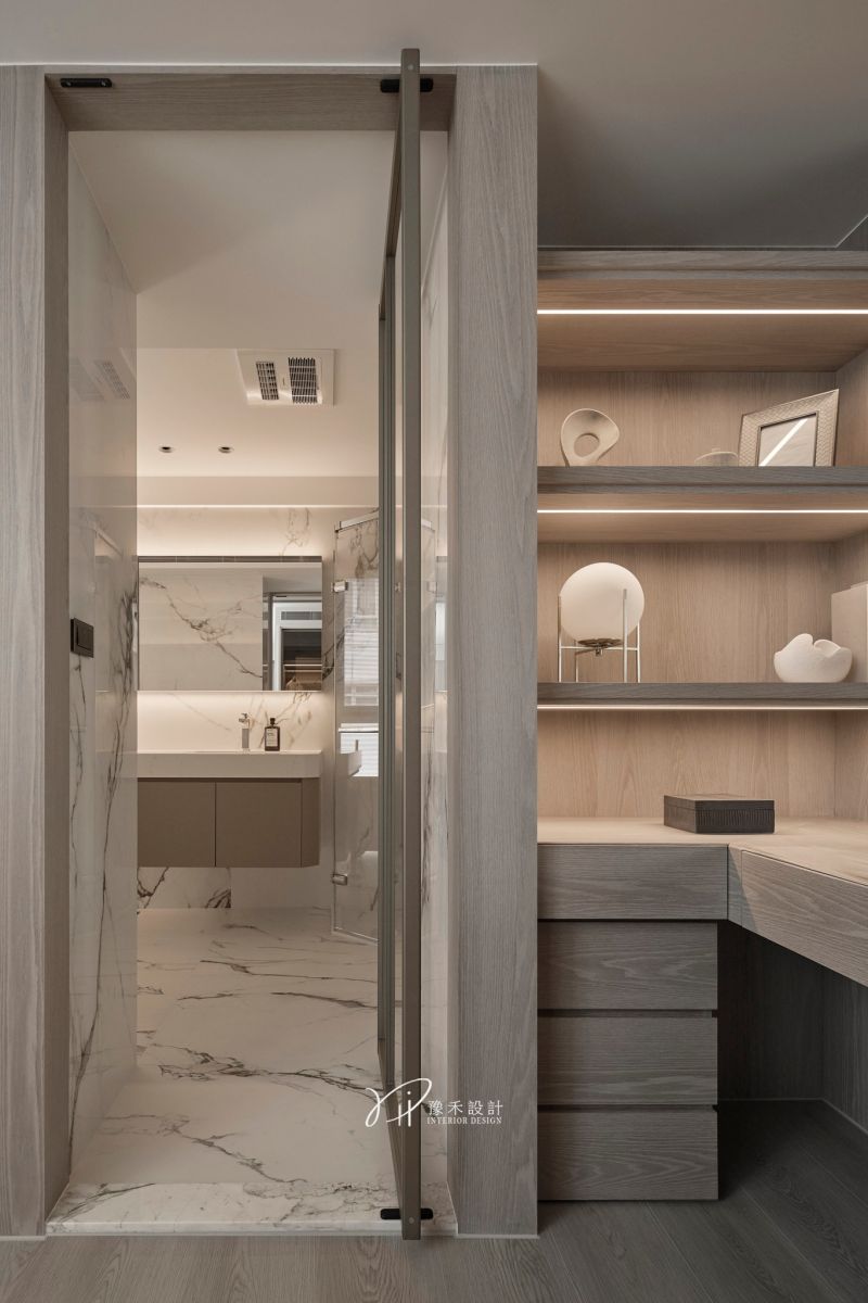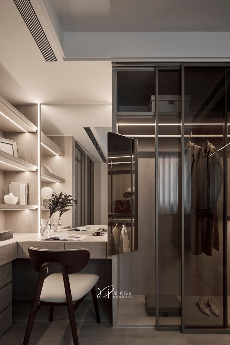 更衣室與衛浴空間木質比例拉高,搭配鐵件玻璃門片,再加上燈光的質感,讓每一件衣服、鞋子、包包都像精品一樣陳列出來,生活的每一時刻都是精緻、都是享受。擺拍設計師在梳妝桌的展示櫃挑選符合空間風格的飾品陳列,陶瓷藝術擺件、燈具、擺飾盒、相框,營造展示與使用情境。