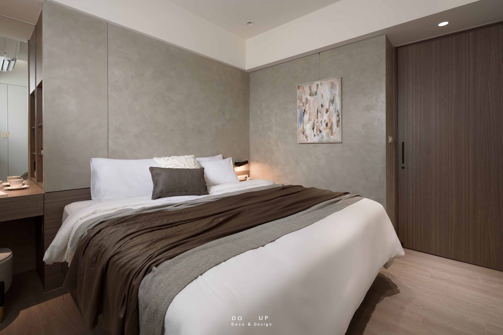 次臥室則展現了極致的「留白美學」,設計師巧妙利用隱形門片與牆面整合,讓小空間視覺更顯洗鍊。軟裝師在此處運用了一抹焦糖色織品點亮視覺重心,搭配天花板落下的微光,將日常編織成一首光影交織的極簡詩。這場由興躍設計操刀、DO UP 深度妝點的生活實驗,讓每一吋空間都充滿了深刻的滋味,成就了士林區最動人的境居敘事。