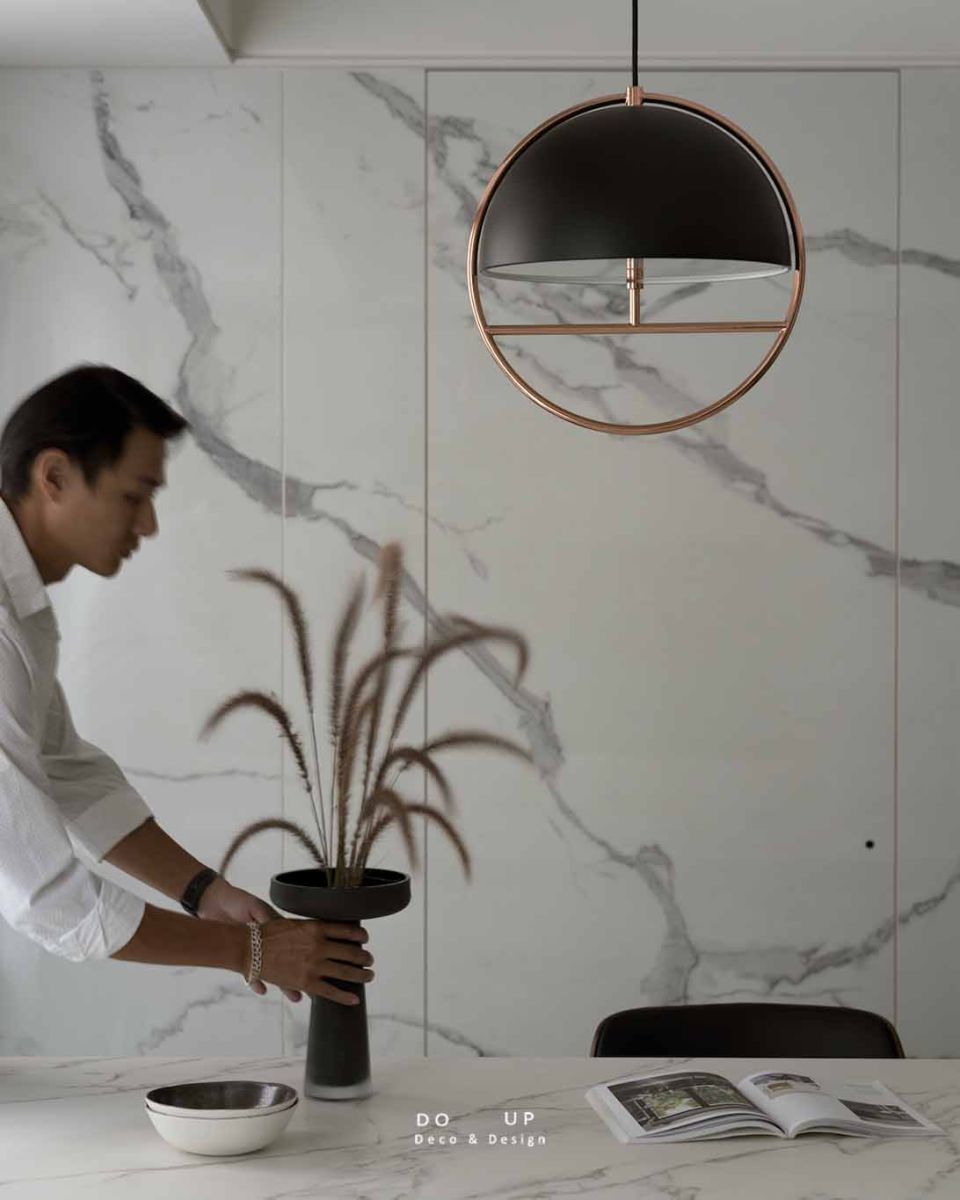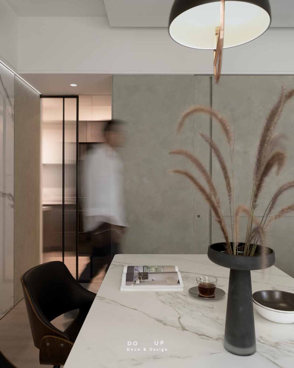 為了豐富空間的視覺高度,我們特別配置了帶有金屬邊框的當代設計款吊燈,其圓潤的半球輪廓如同一枚私藏的星點,在用餐時分灑下醇厚溫馨的光暈。透過空間陳列擺拍的精準定位,這些家飾物件不再只是配角,而是 DO UP 賦予「大南境居」的靈魂註腳,讓每一次餐敘都像是在 18 坪的知性小島上,享受一場逃離外界的時髦散文。