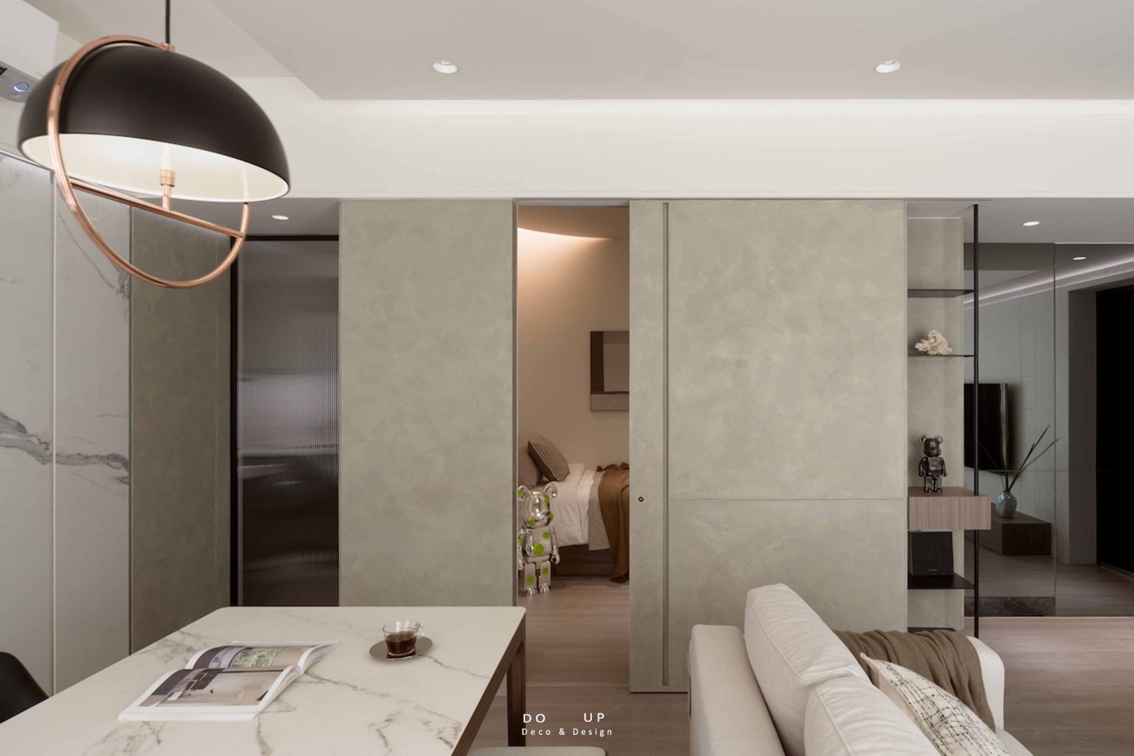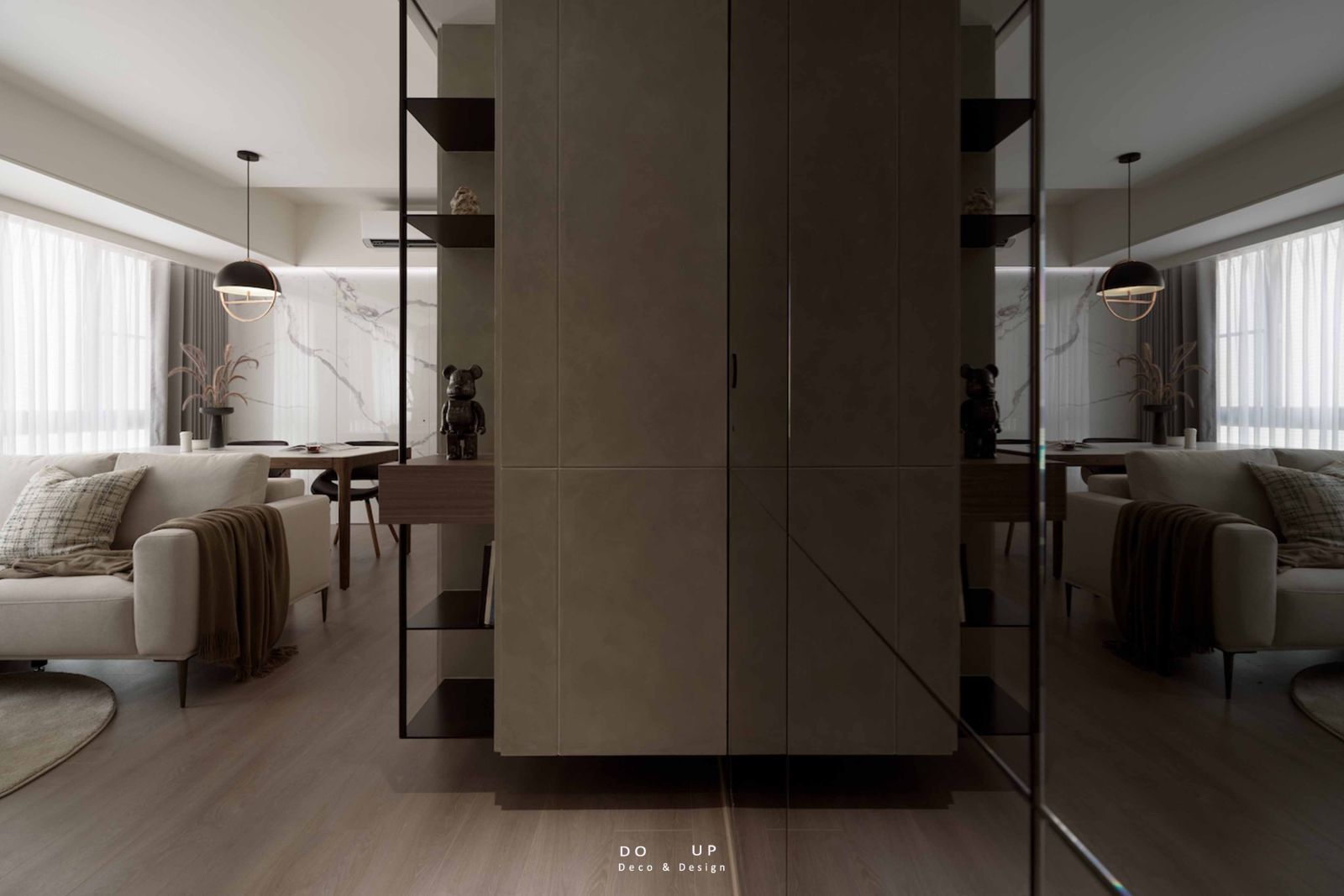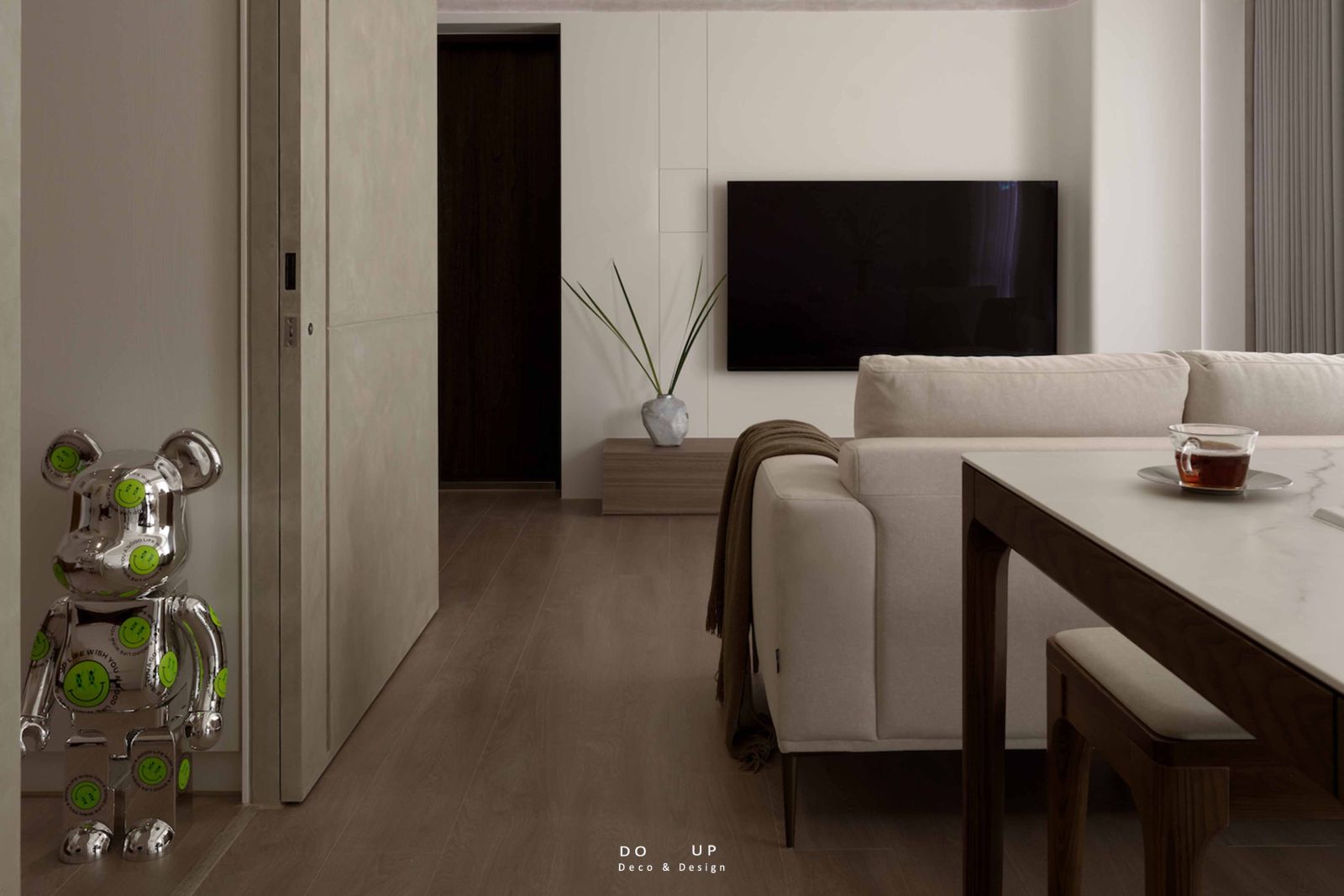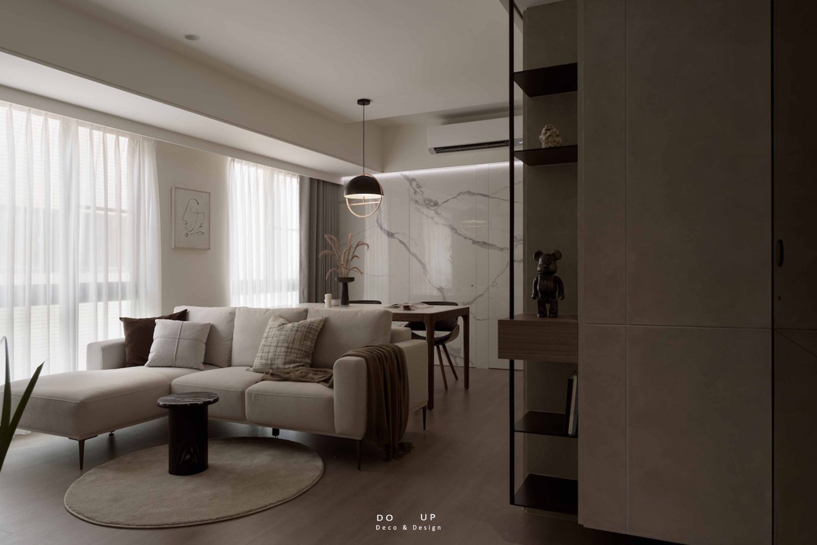 為了中和硬裝線條的冷冽,我們特別挑選了觸感細緻的米色 L 型織紋沙發,並隨意披上一條咖啡色系的大地毯與針織披毯。這種由深咖啡至燕麥色的色調轉場,讓異材質的碰撞不再只是視覺衝擊,更轉化為一份「家」的包覆感。而在沙發旁閃耀著時髦光澤的 Bearbrick 公仔,則是軟裝師埋下的趣味註腳,讓這場關於比例與材質的探索,在優雅中依然保有都會生活的活潑靈魂。