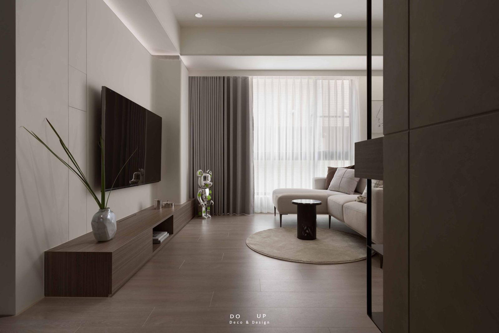 DO UP 擺拍物件希望空間具備個性感。在電視長几的一隅,我們安置了一只線條挺拔的極簡花器,幾抹自然延伸的枝幹在純淨牆面前勾勒出如同現代畫般的藝術構圖。這份刻意的留白,正呼應了設計師對於當代都會生活的精緻定義。