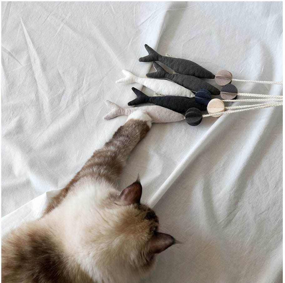 Fish&chews 逗貓棒是一款為貓孩量身打造的玩具,由職人以手工製作,以觸感舒適的可水洗彈性棉麻織布製成。樺木手柄保有了自然手感,提升了整體的質感。吊墜設計成魚的形狀,讓飼主與貓孩在遊玩時,有如在湖邊釣魚一般,構築出一幅簡單美好的景象。