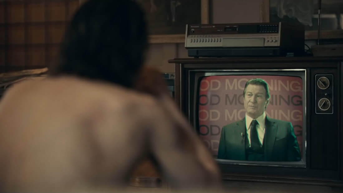 小丑一席飽和度極高的紅色演出服,橘色的背景與小丑的背心,襯托了紅色的血艷,也象徵著報仇與即將爆發的邪惡,後方的主持人的巨大笑臉在此顯得詭異而諷刺。空間中的橘色家具以及鐵件椅子,都是當代現代風格的家具,代表著影視界的無意遮掩的高調與時髦。