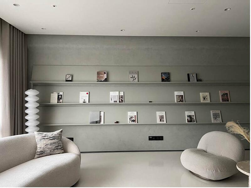 原本前身空間硬體裝修有層架和高彩度的橘色,所以空間色調以及定位,我們重新規劃了電視牆的設計以及使用烤漆及司曼特粉刷電視牆,灰色油漆以及層板讓此電視牆不再只是電視牆,還可以放置業主的鋼琴琴譜以及收藏的書籍、照片,給予了不一樣的空間氛圍以及視覺感受。