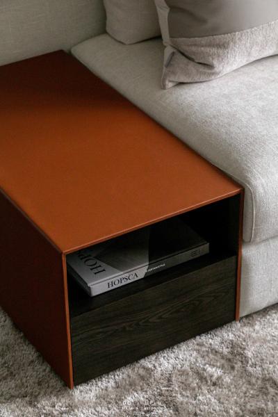 軟裝師以活潑亮麗的橘色系作爲空間主色,並挑選同色系的家具家飾搭配上金色檯燈提升空間質感,寢具的部分則選用大面積黑白灰為基礎搭配焦糖棕色皮革抱枕提升空間質感,營造活潑精緻的空間調性。