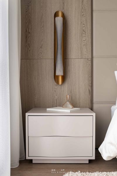 線條簡單俐落的床頭櫃搭配上琥珀色香水擺飾與舒適營造精緻簡約的睡前角落;梳妝台上挑選的大理石與金色相互搭配的桌燈及米色皮革椅凳勾勒出優雅舒適的梳妝空間。利用家飾品、家具、燈飾的造型與材質相互交織引領出低調精緻華、具有藝術人文質感的空間氛圍。