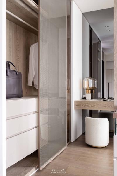 室內設計運用了大量的米杏色和玫瑰金色鐵件營造出柔和舒適的空間氛圍,軟裝設計的部分挑選與空間色調相符的絲質襯衫、黑白色系的外套與白色襯衫於開放衣櫃上並在上方擺上棕色系的絨布首飾盒展現出輕奢舒適的生活品味。