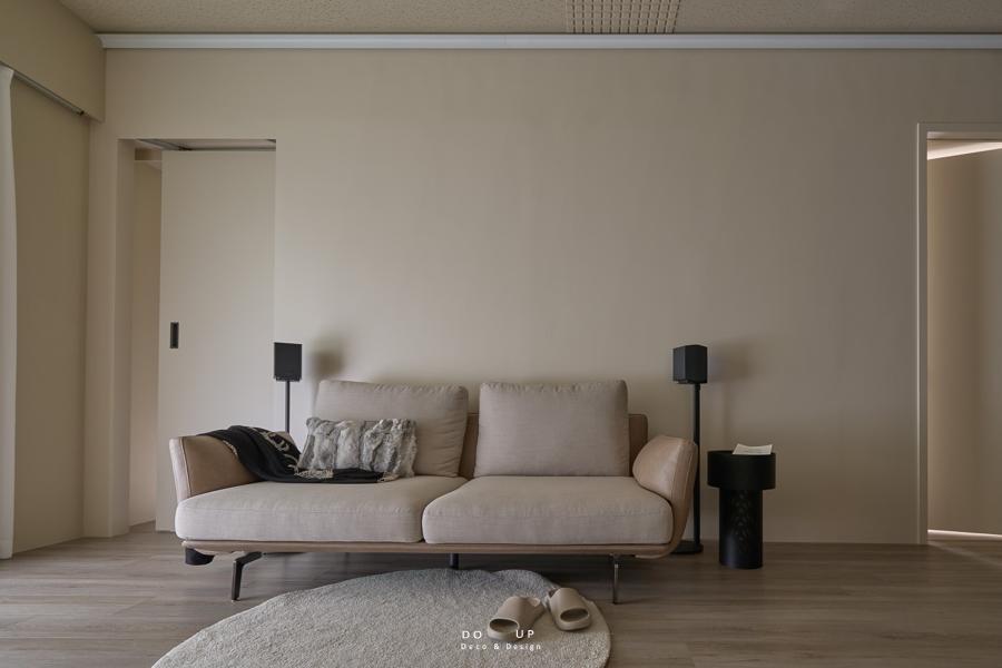 搭配簡約而現代的沙發來強化空間的功能與美感,我們不希望空間整體顏色太過一致性,因此我們挑選有跳色的沙發,來與奶茶色的空間氛圍,做一個區個。地板運用專業的手法將其改造成卡扣地板,並使用特殊與一般漆料重新粉刷,使得整個空間不僅保持了色彩的一致性,還提升了整體的明亮感。