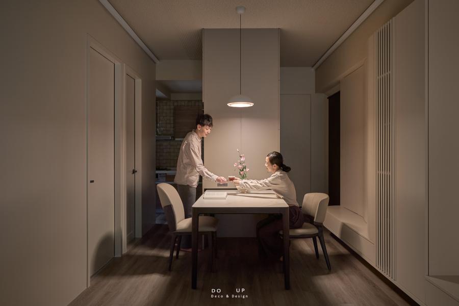 現在的居住者,餐桌其實是一個很常使用的地方,可能會在餐桌用餐、用電腦、聚會、小孩寫功課,因此我們搭配一盞可以調整亮暗、色溫的吊燈,讓此空間更具氛圍外,也可以具備功能性。