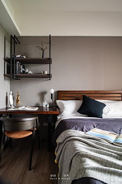 兩間臥室都是水泥粉光牆面,因此選用了一些淺色及白色的飾品去做搭配,同時也是和設計師所設計的鐵件層架形成對比,桌上的書本與床上的毯子讓整體更有家的感覺!