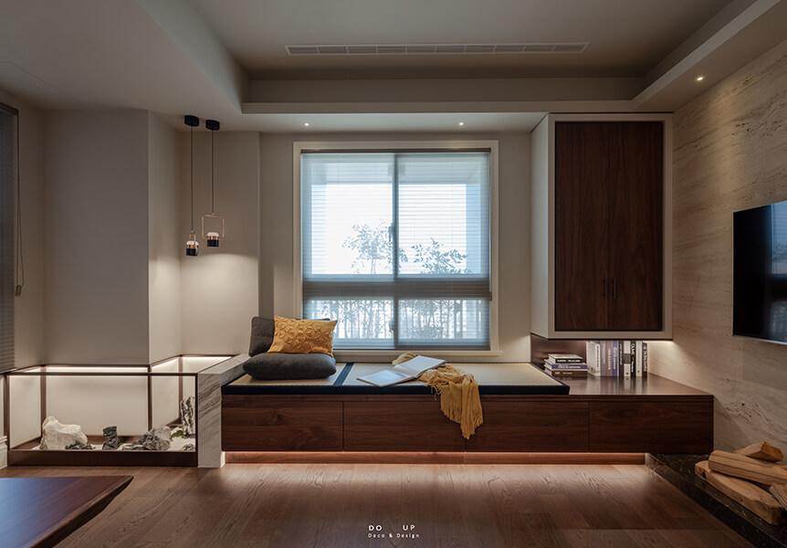 書房有著大面積的木頭書櫃,書櫃揉合光影,形成流動的故事軌跡,書籍的安置處讓整體空間給人一種穩重感。