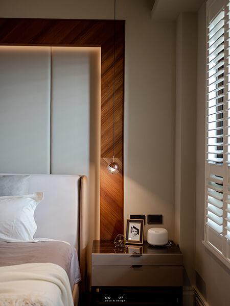 副臥宛若優雅的主人,乾淨利落的窗迎來柔和的光線,其採用木頭元素所創作的床頭櫃設計,我們在佈置上以一張灰色調水彩畫作,與床架的灰色調做為搭配。