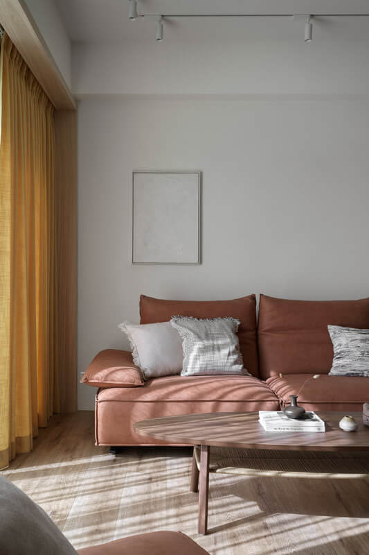 軟裝設計上,暖橘色的沙發搭配木質茶几,用質樸有溫度的飾品,去營造空間風格。