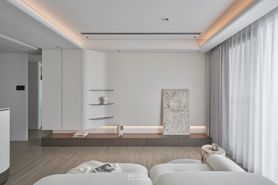 這次的空間擺拍案,是位於中和的現代風格寓所,窗外就是綿延的河景。整體為開放的格局,客餐廳廚房都在同一個空間,室內設計師在這個場域勾勒出不同的弧形曲線,像是一條靜謐且沉穩的河川流淌在這個空間中,隨著視野一起匯流到窗外水天一線的廣闊。而溫潤的木紋與簡單的設計,讓整體的空間風格顯得寧靜而美好。