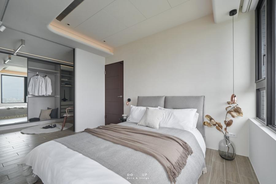 天花板的弧形造型一路延伸來到主臥室,讓整體空間更有連貫性。主臥室延續了公共區的設計語彙,除了一層層的弧形以外,更衣室的門片使用大面的玻璃與鏡子,讓窗外的景色可以無時無刻的在這個空間暢揚,家中每一個角落都像一幅能欣賞的畫作。