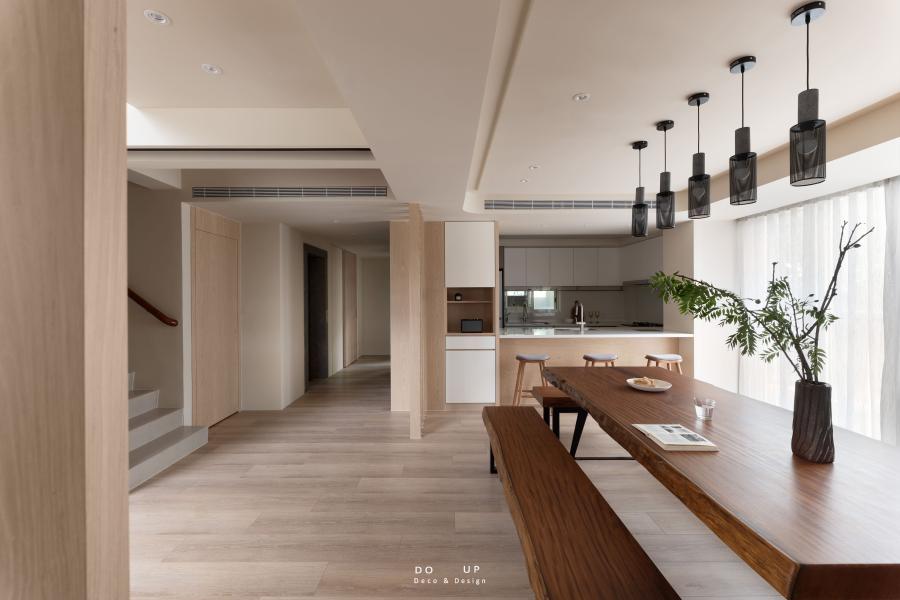 通透的透天居所伴隨著陽光灑進,為空間點綴出最美好的樣貌。用日式的空間風格並加入復古的元素,為空間打造出獨特的風格和氛圍。大型的實木餐桌,彷彿擷取了日式的生活體驗,並將外面的綠意帶入了家中,體驗自然與放鬆的日常時光。