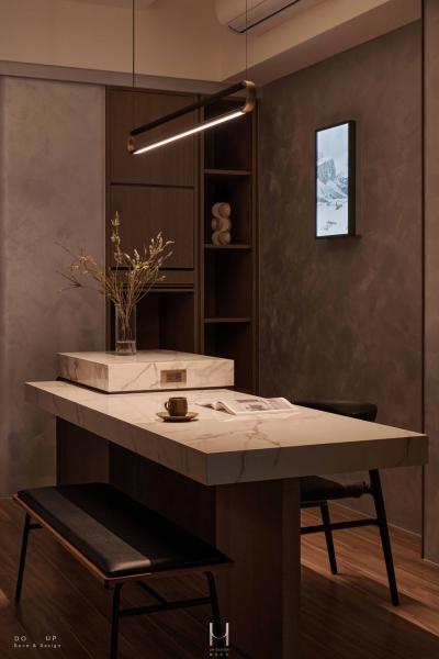 在這個居家空間中,餐廳區域展示了簡約質樸的設計。中心設計的大理石餐桌,配合簡潔的燈具,不僅實用而且兼具時尚感,創造出一個具有質感的用餐環境。