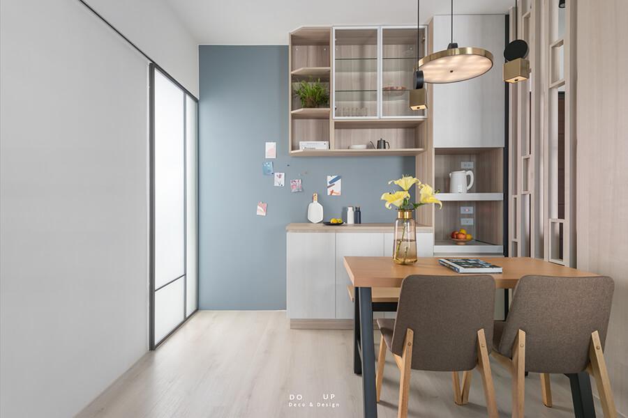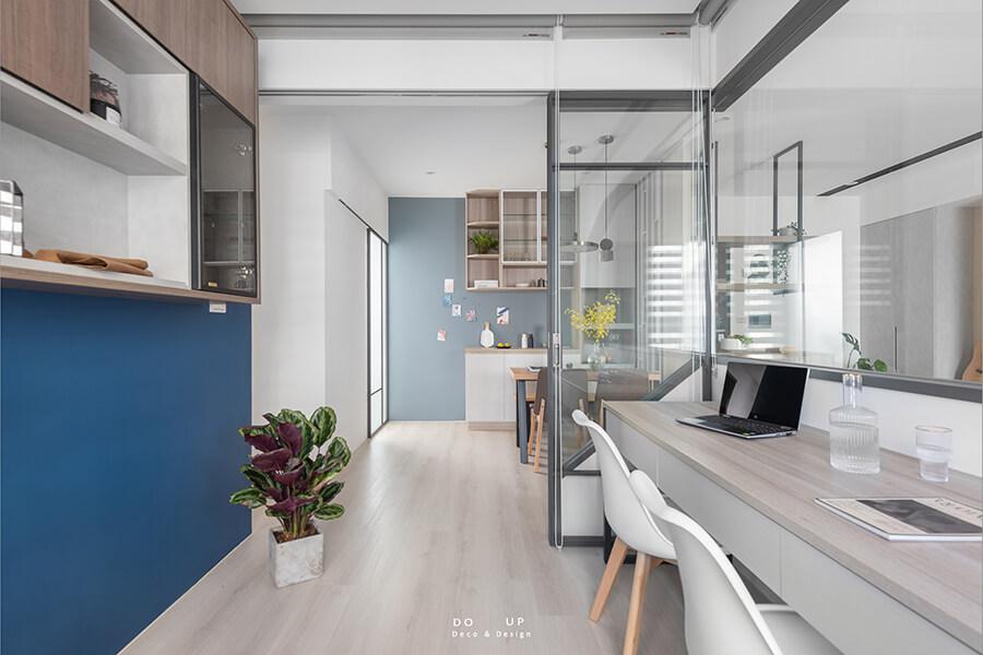以半牆與玻璃將空間區隔,保留視覺與光線的流暢通透,設計感十足的外框使室內空間多了亮點與立體感。各種色階的灰與海藍交織了一種沈穩的調性,普入家門,生活的步調,因為和諧的風格搭配而開始放緩。
