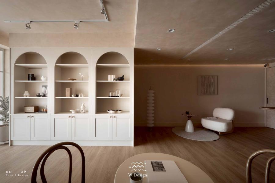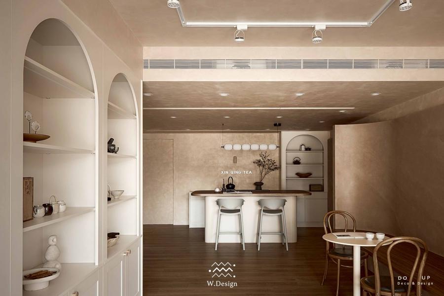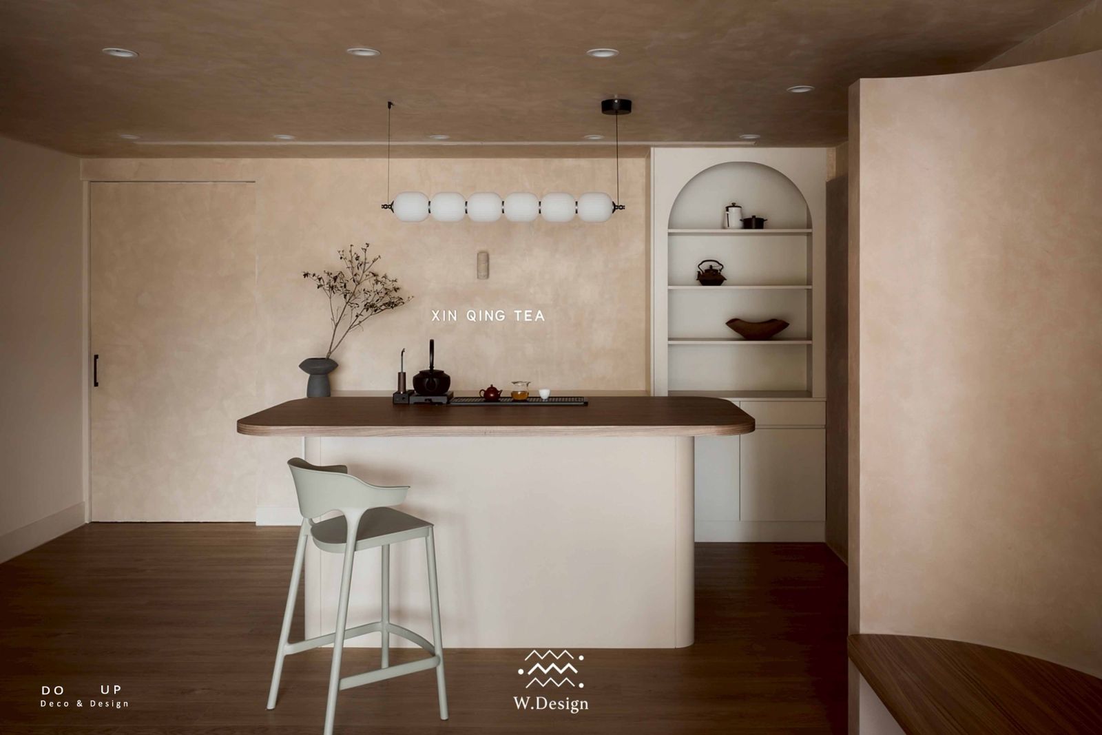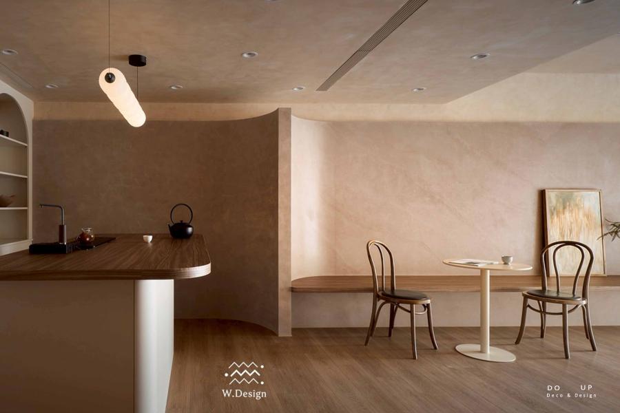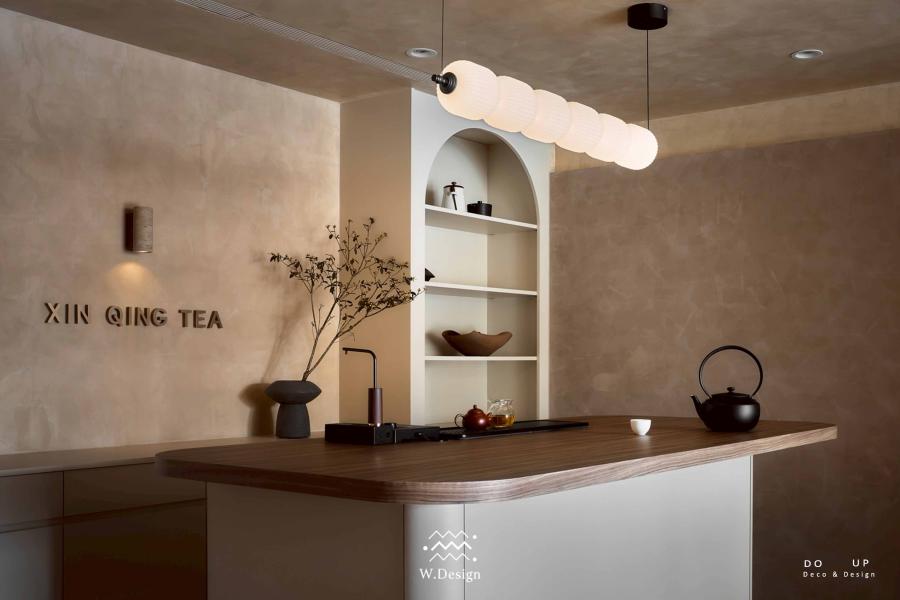 砌茶區是店面的核心靈魂,代表著專業與溝通。設計師在此運用暖色系的牆面塗料,並從牆面的優雅弧線延伸至此,搭配溫潤的木質地板,共同奠定了空間的溫度感。