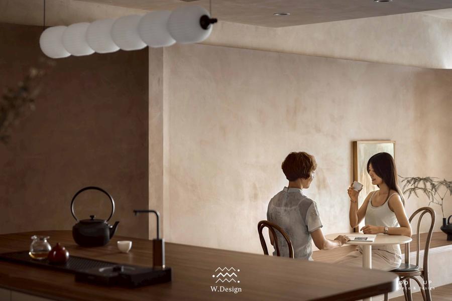 座位區不再只是歇腳處,而是專屬於居住者的私人藝廊。軟裝師在低彩度的空間中,選用溫潤的木質家具,為空間添入自然肌理,這種留白的佈置讓客人擁有更寬闊的品茶空間。搭配沙發如雲朵般的柔軟曲線,以及點綴其間的些許綠植,讓空間氛圍更加柔和與放鬆,展現自然而樸實的生活美學。
