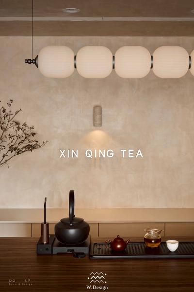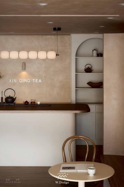 透過專業的軟裝設計,DO UP將材質、色彩與光線重新組合。室內設計師在吧台上空選用圓形吊燈,柔和的光線不僅提供專業的照明,更營造出視覺的「端景」,同時巧妙地將焦點集中在後牆的品牌標誌上,強化了品牌識別度。讓砌茶區不再只是吧台,而是專屬於專業製茶工藝的展示台。軟裝佈置則藉由素雅的花器、少量的飾品點綴,讓空間保持簡約而有重點。