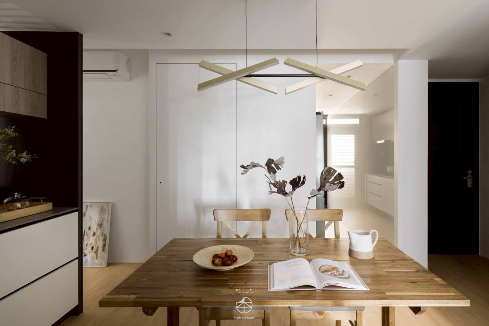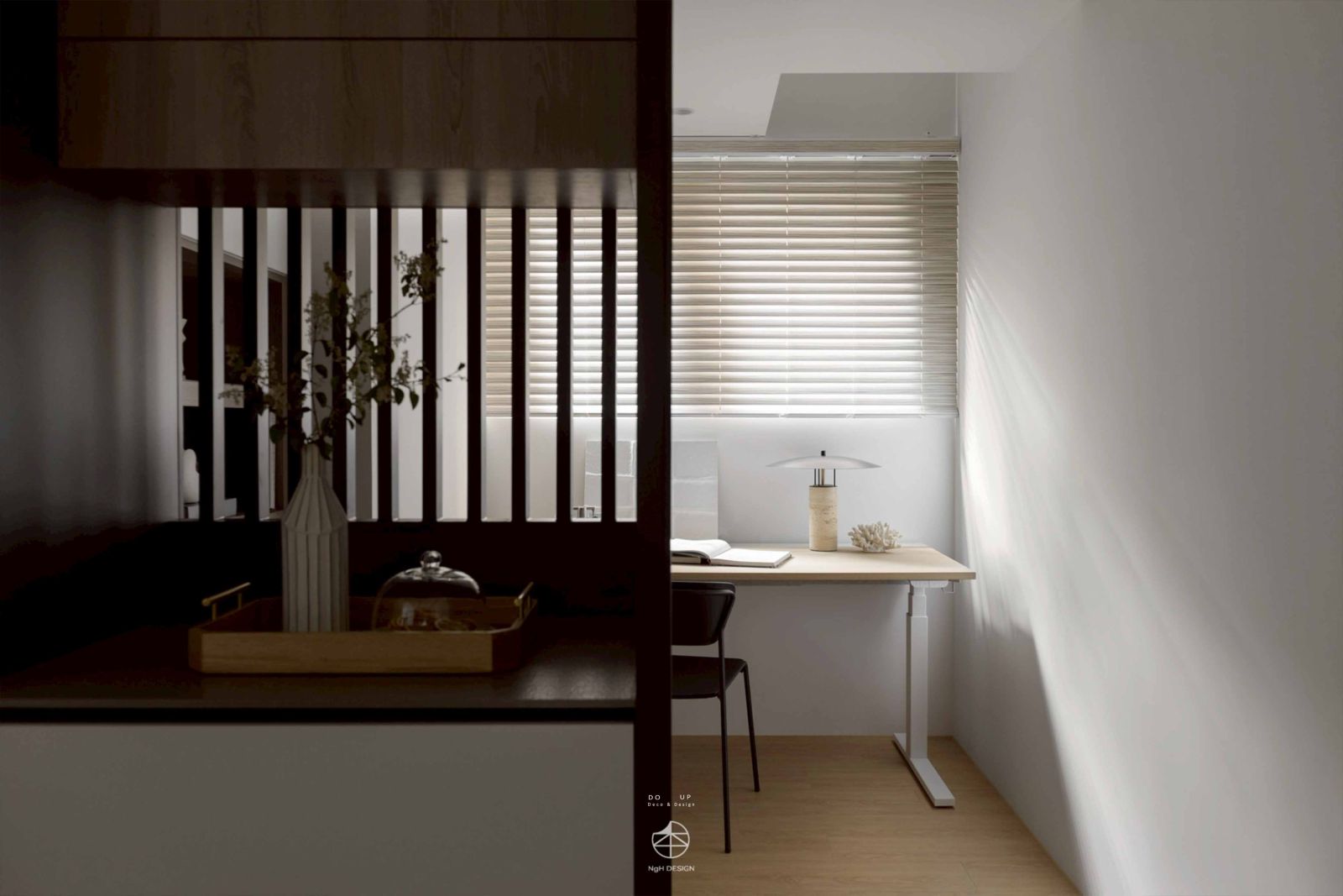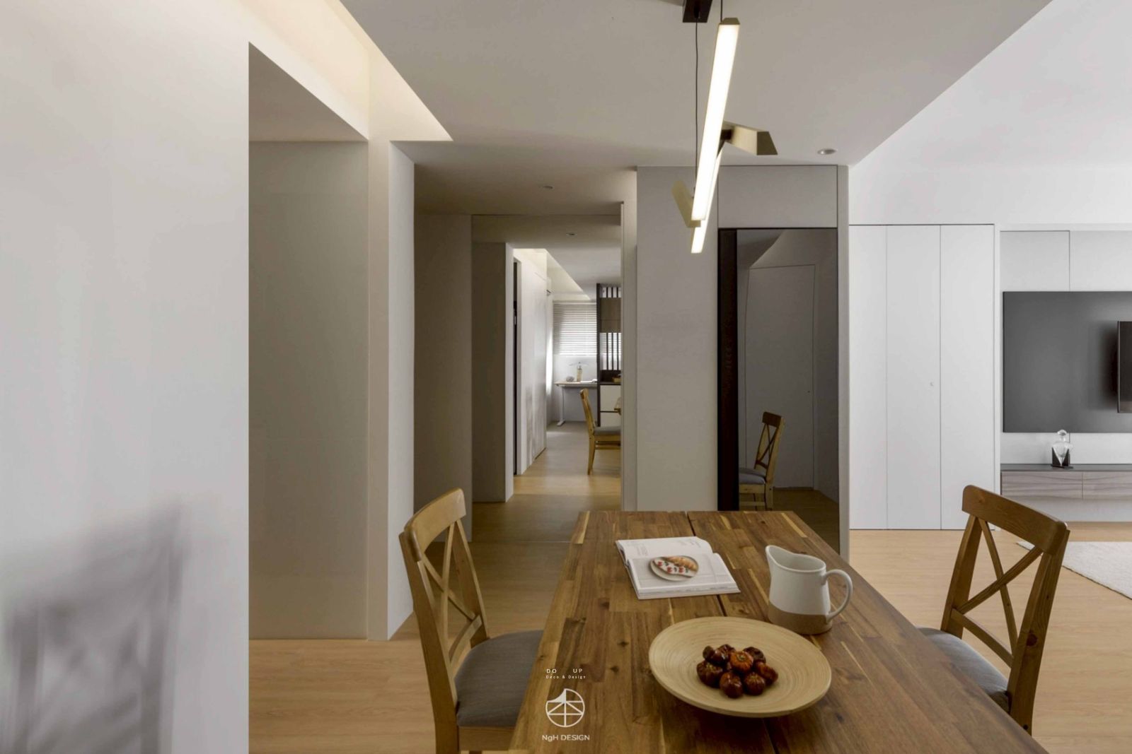 低天花的線性軸線貫穿餐廳與書房,整合餐敘、閱讀、工作。在家的中心「餐廳」,設計師極力加強光線導入,結合北側微光與西側日照,形成柔和的雙重採光。這段L型室內設計動線,不僅是流線設計,更是居家辦公者生活節奏的規劃。