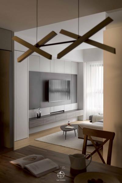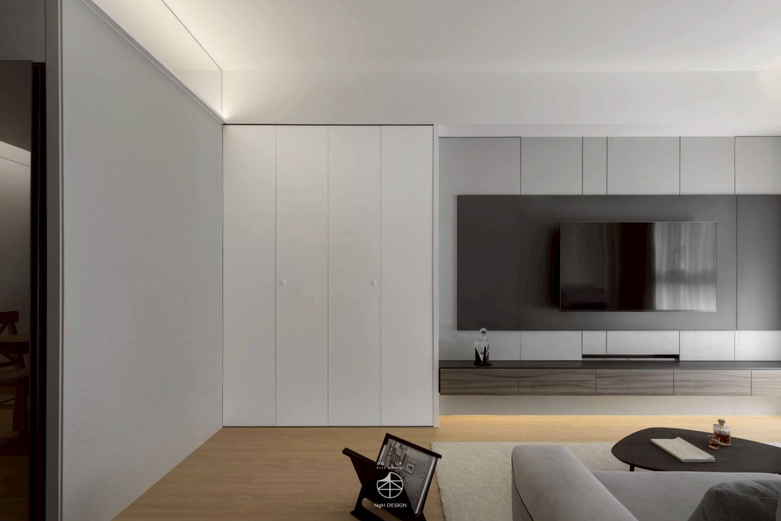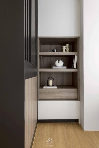 室內設計師巧妙運用空間電視牆左側的收納門片錯落開合,在實用之外創造出充滿節奏感與可變性的立體層次。