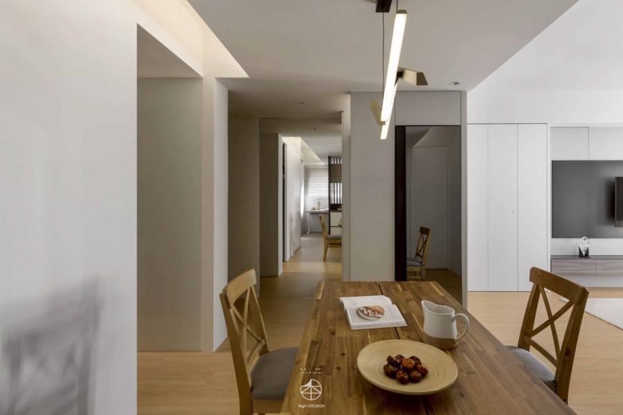 陽光穿透備餐檯格柵,形成如同舞台般的日光光錐,讓日常用餐具備儀式感。空間佈置在廊道處透過挑高的天花與線型光源,創造「光在引導動線」的流動感。