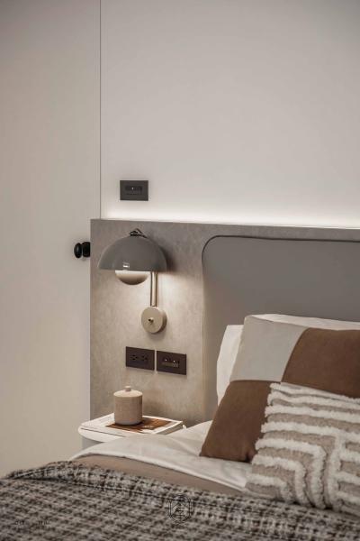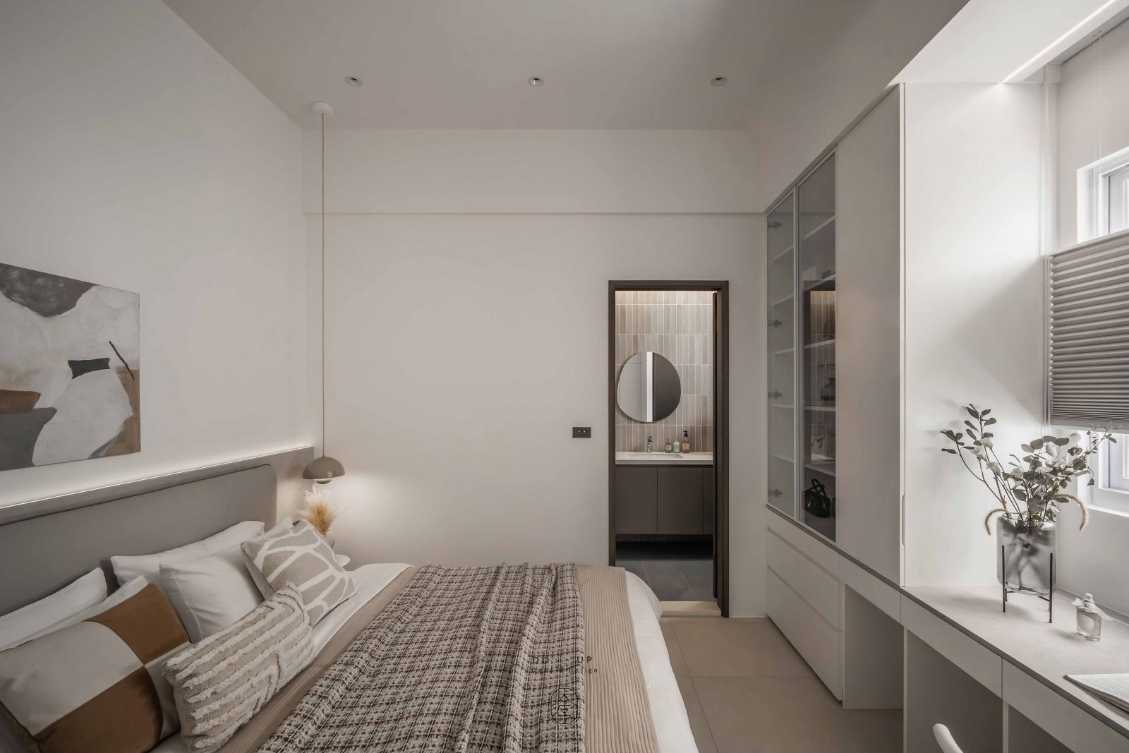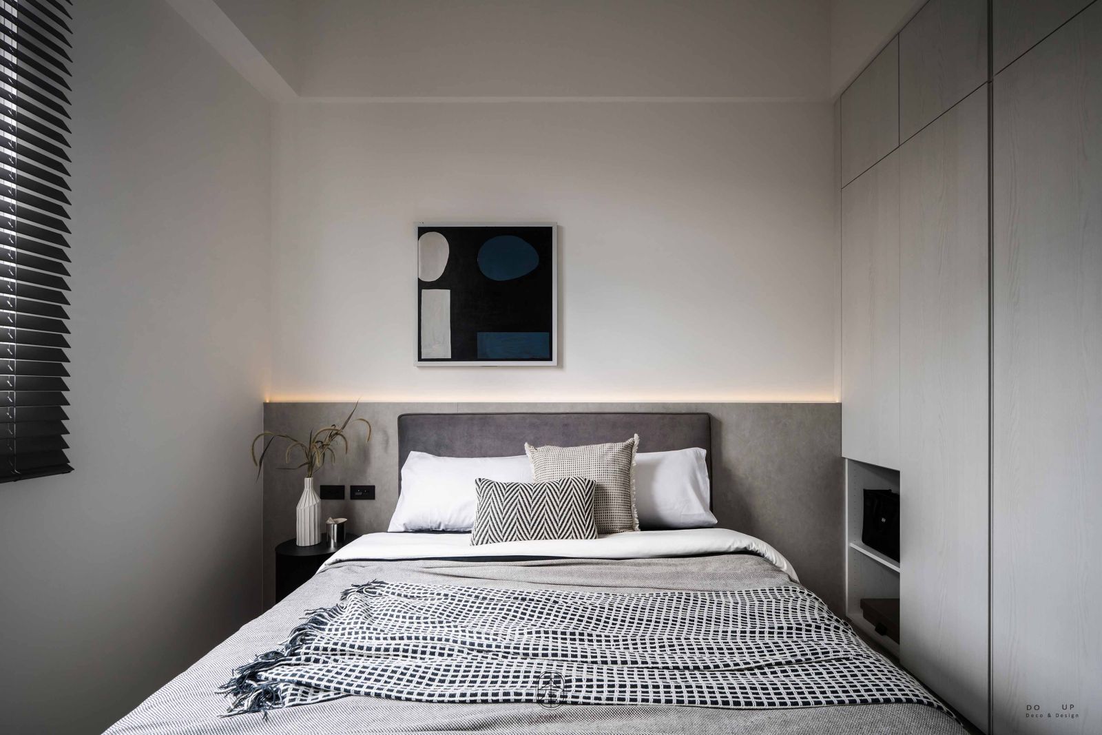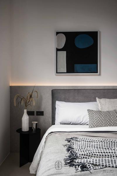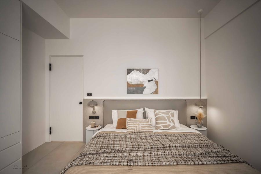 在基底大量白色的空間,室內設計師用俐落的線條、床板跳色與花苞吊燈打造簡約舒適的臥室空間,軟裝設計師搭配不同的花紋抱枕與格紋織毯,增加優雅溫暖的氛圍,點綴壁掛畫作呼應軟裝與空間色彩。