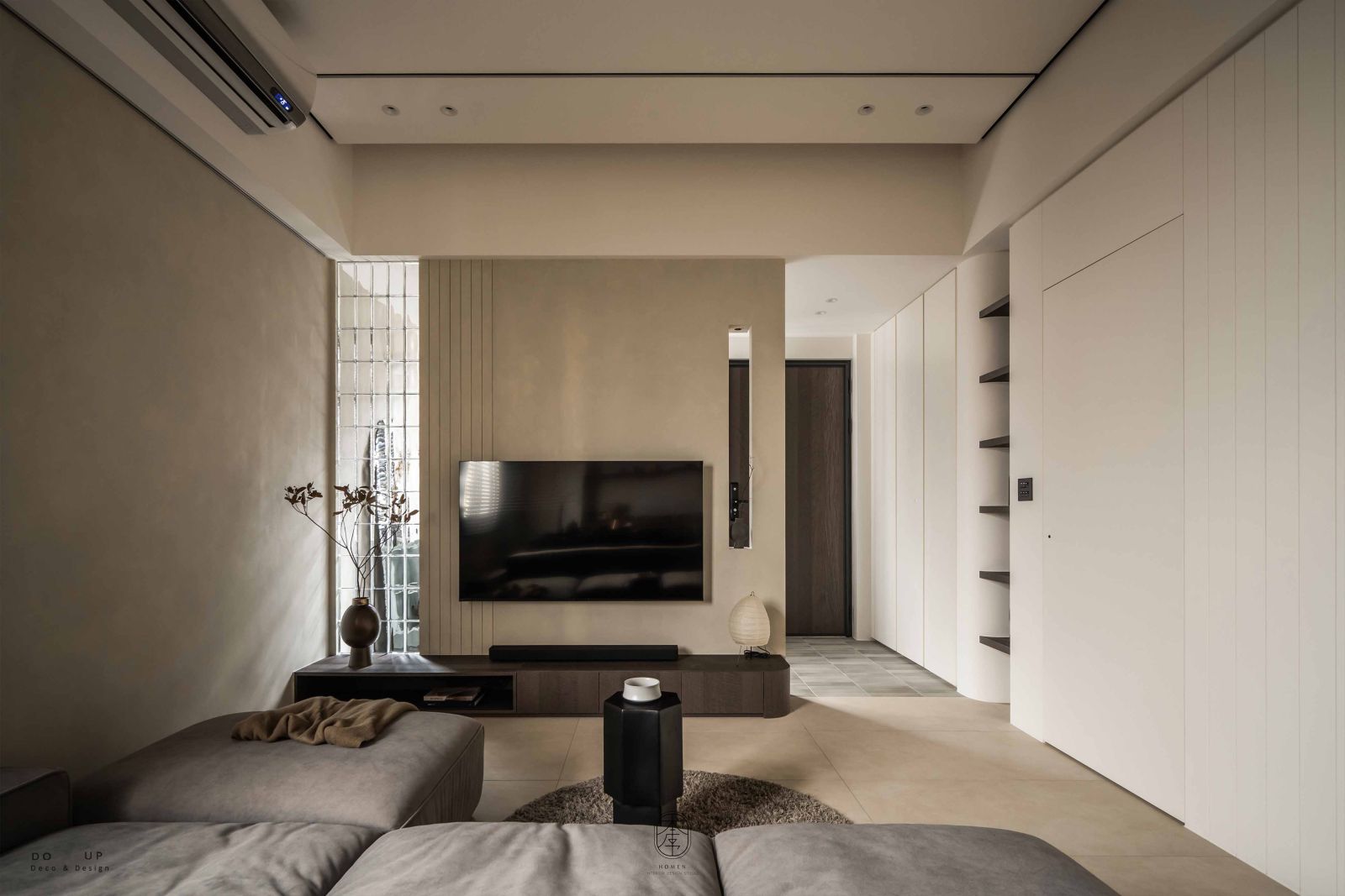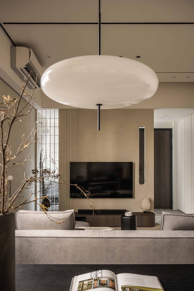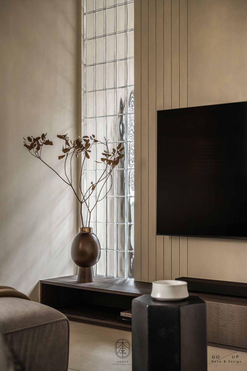 室內設計師用玻璃磚以及造型電視牆將光引入客廳空間,電視櫃擺上古銅色造型花瓶,插上精選的枯葉枝條,背光呈現的光影流淌,隨著不同時間推移,讓每一刻都是珍貴。