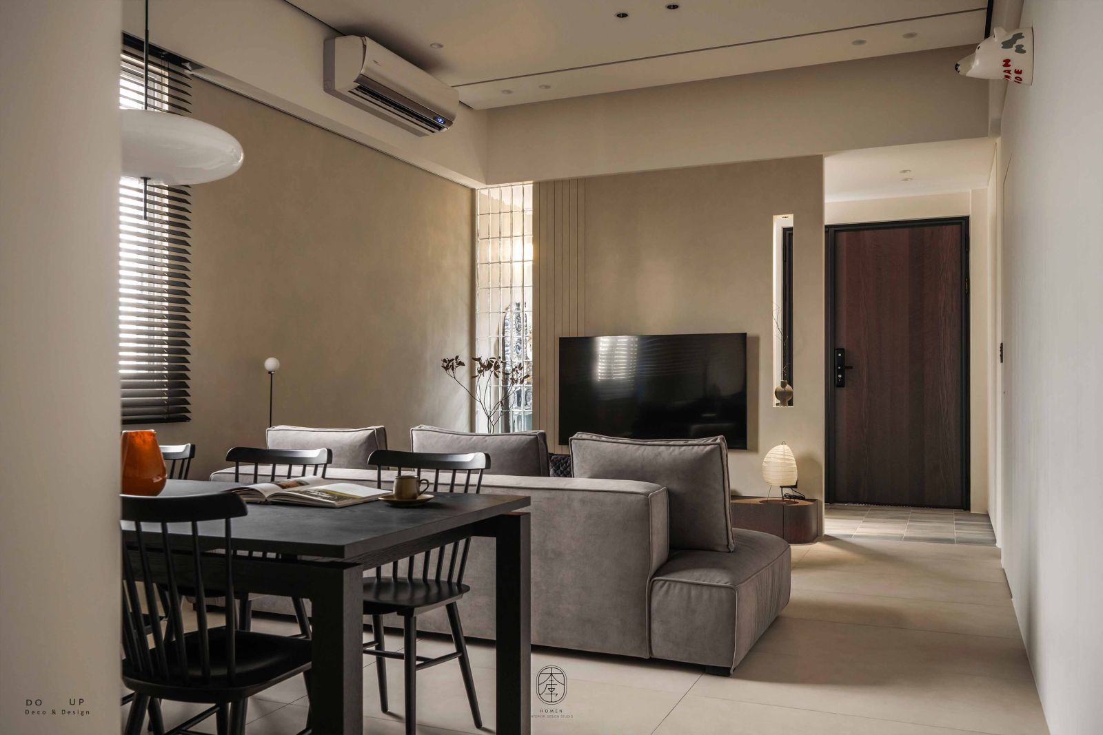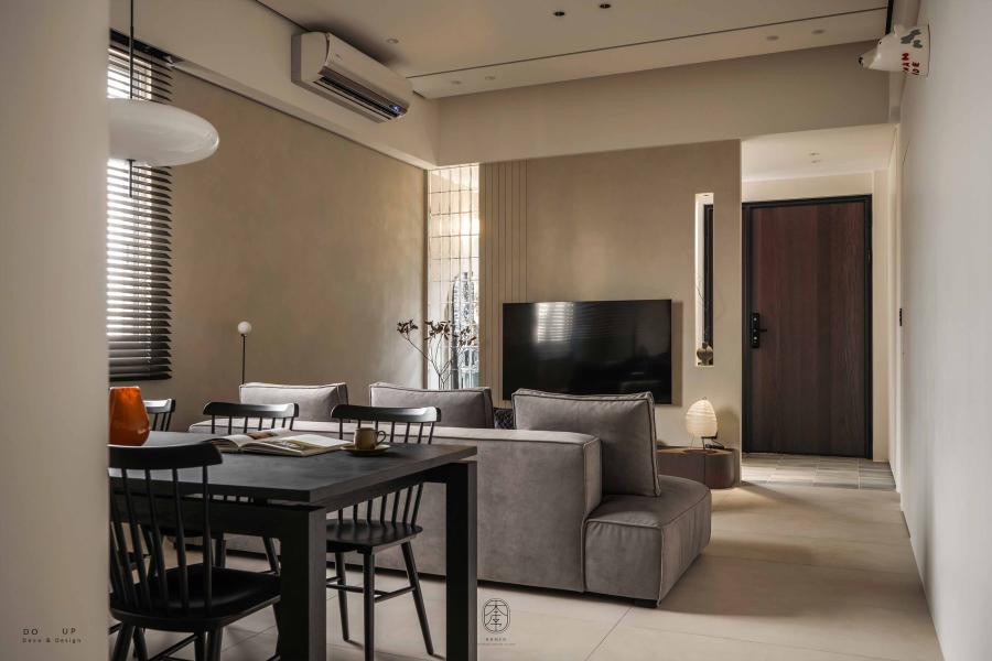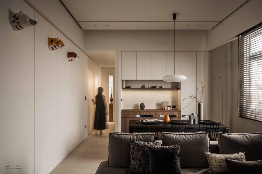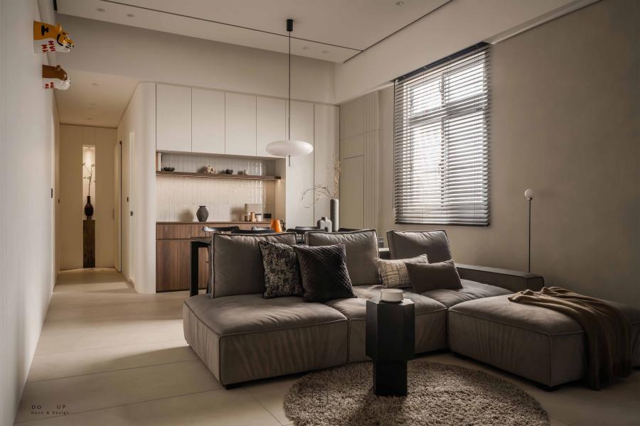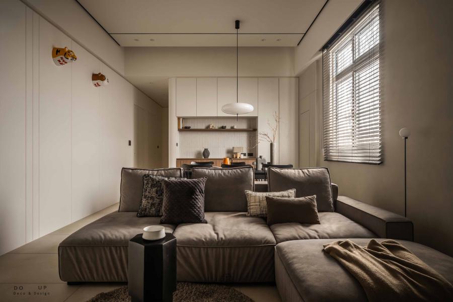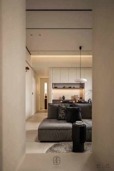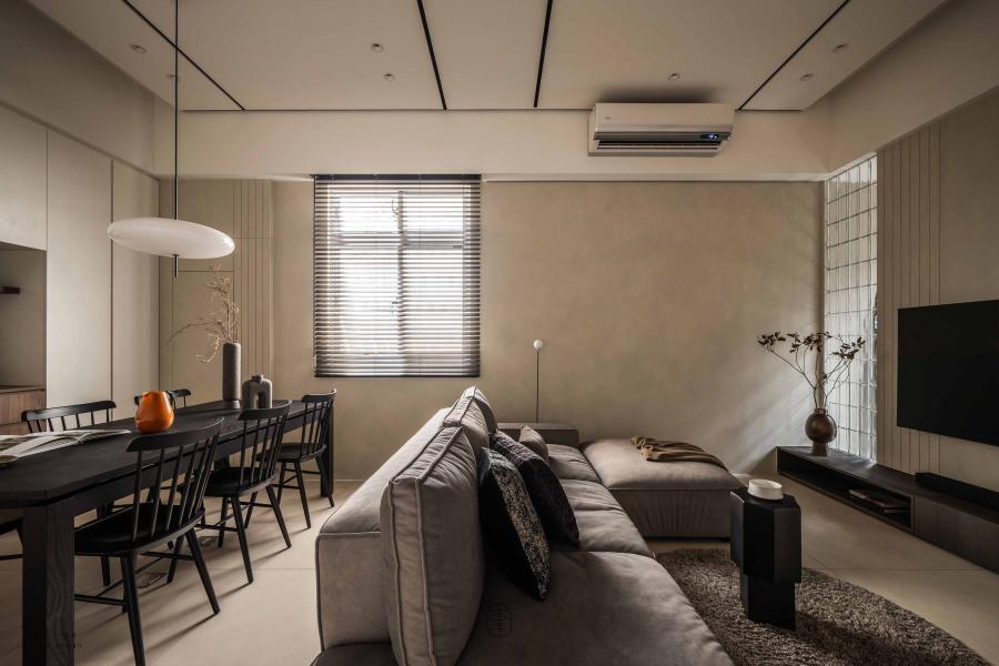 在帶給人內斂、藝術質感的居家空間裡,軟裝師搭配不同材質來增添更多的肌理人文質感以及相呼應的巧思,在客廳區希望營造出沈著穩定的氛圍,以暗色系及不同家具、抱枕蓋毯的造型、皺摺堆疊層次,提升溫度。