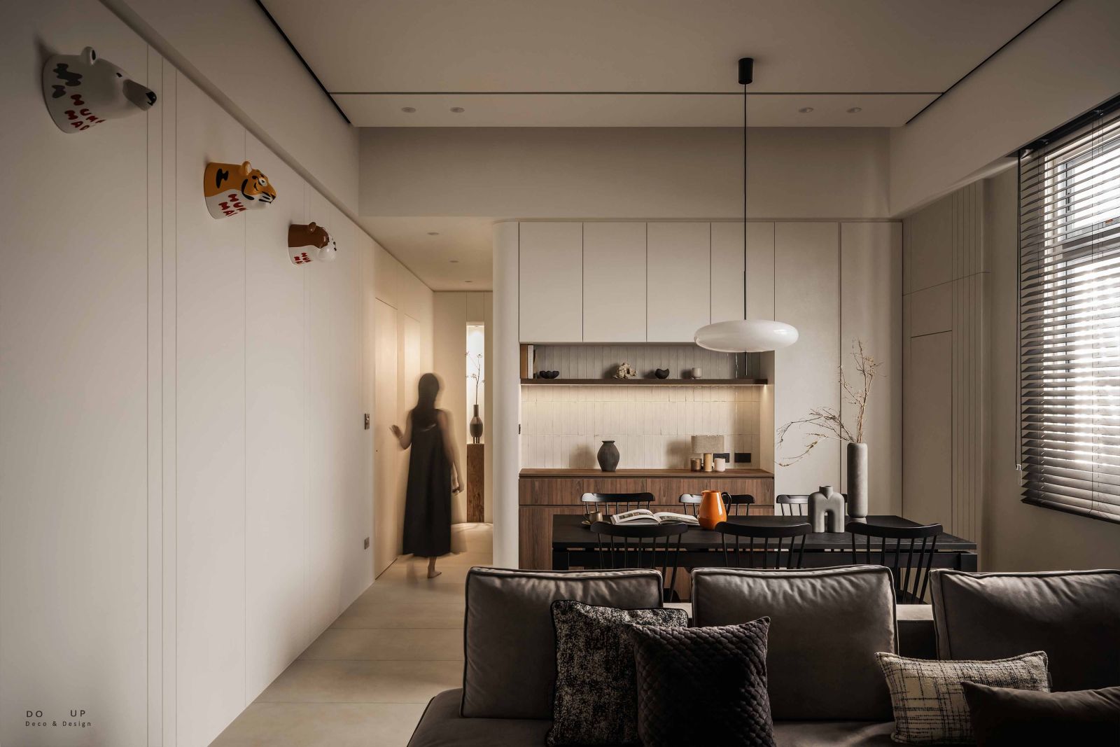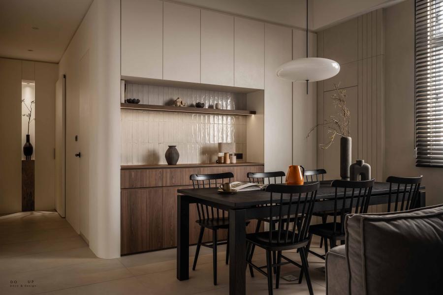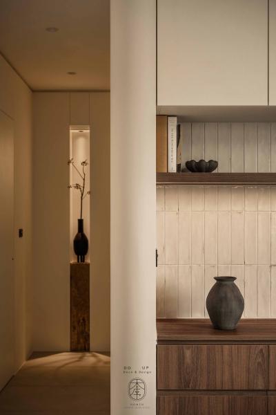 餐邊櫃與走道端景用藝術品陳列的方式,簡單、有節奏,石材、瓷器、木頭、枝條,不同材質元素卻也不搶彼此風頭,靜靜的成為這裡的一份子。