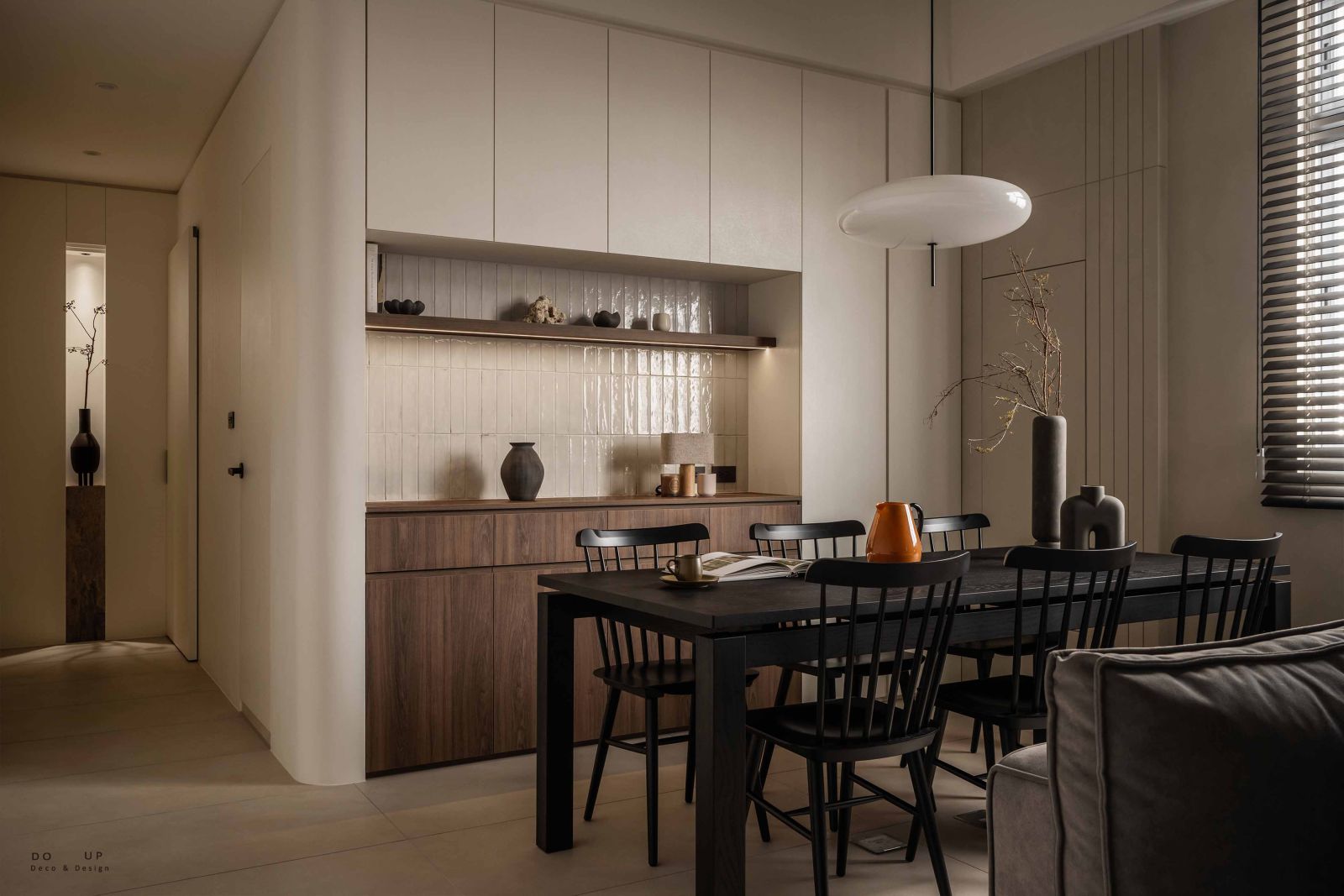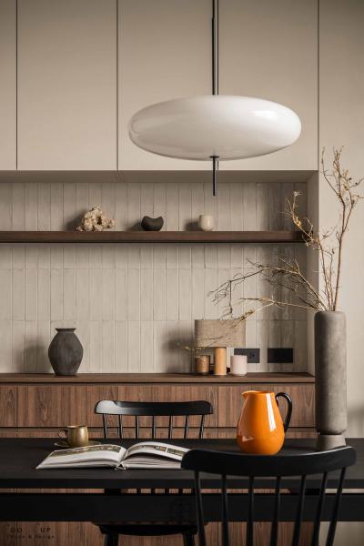 凝聚的餐廳空間,黑色木桌與木椅的個性,與白色玻璃吊燈對比,擺上鮮豔的橘色玻璃壺,讓視覺焦點集中在餐桌區,擺上灰黑高低錯落花瓶、插上流線枝條,為空間帶來不同的語彙。