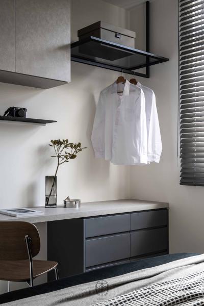 在黑灰白的空間基底中,軟裝師延續整體的份圍,用剛好的比例搭配,黑色點綴、白色點亮、灰銀色增加細節質感,在畫作中增加深藍色帶點趣味,好似品味生活、個性鮮明的青年,每一個角落都是精心規劃的。