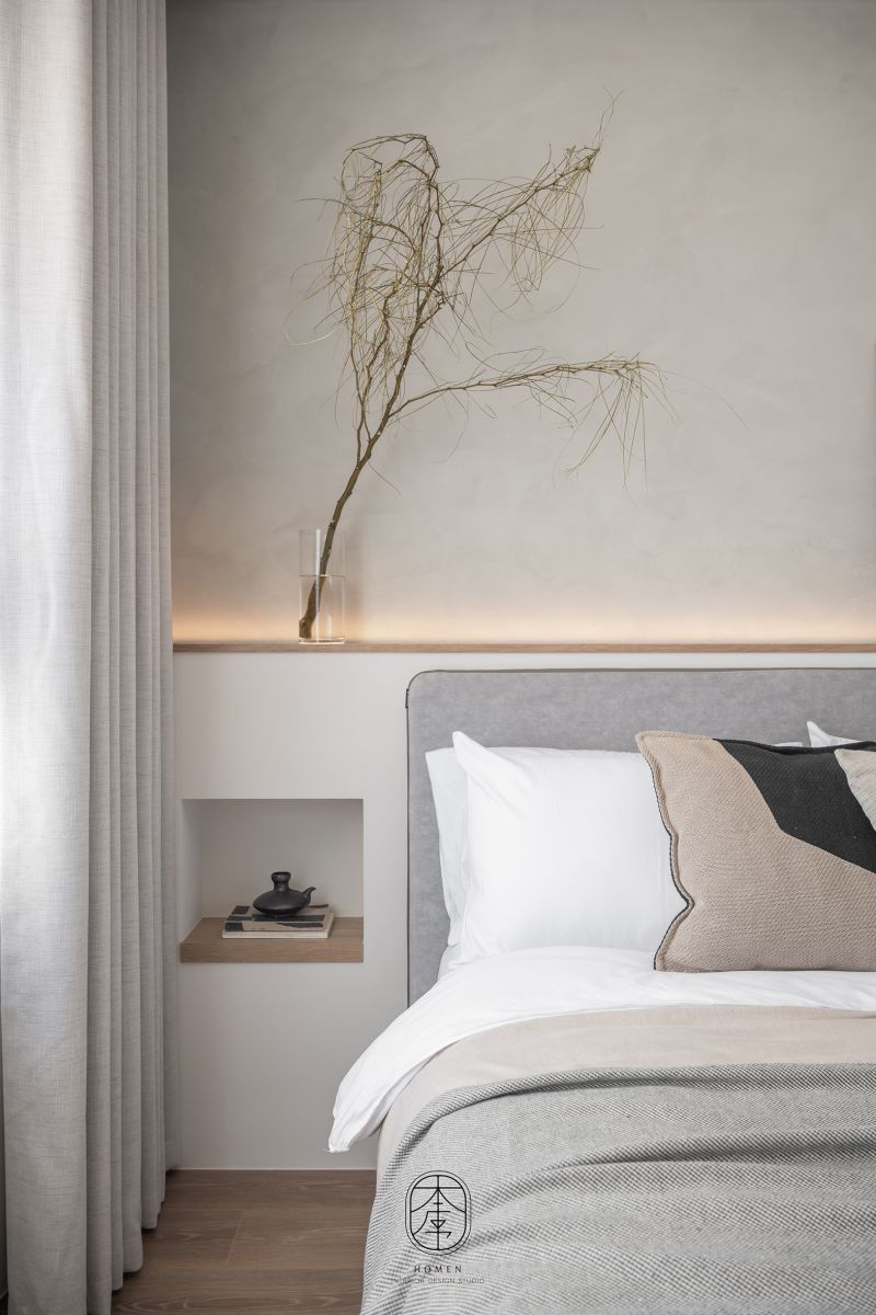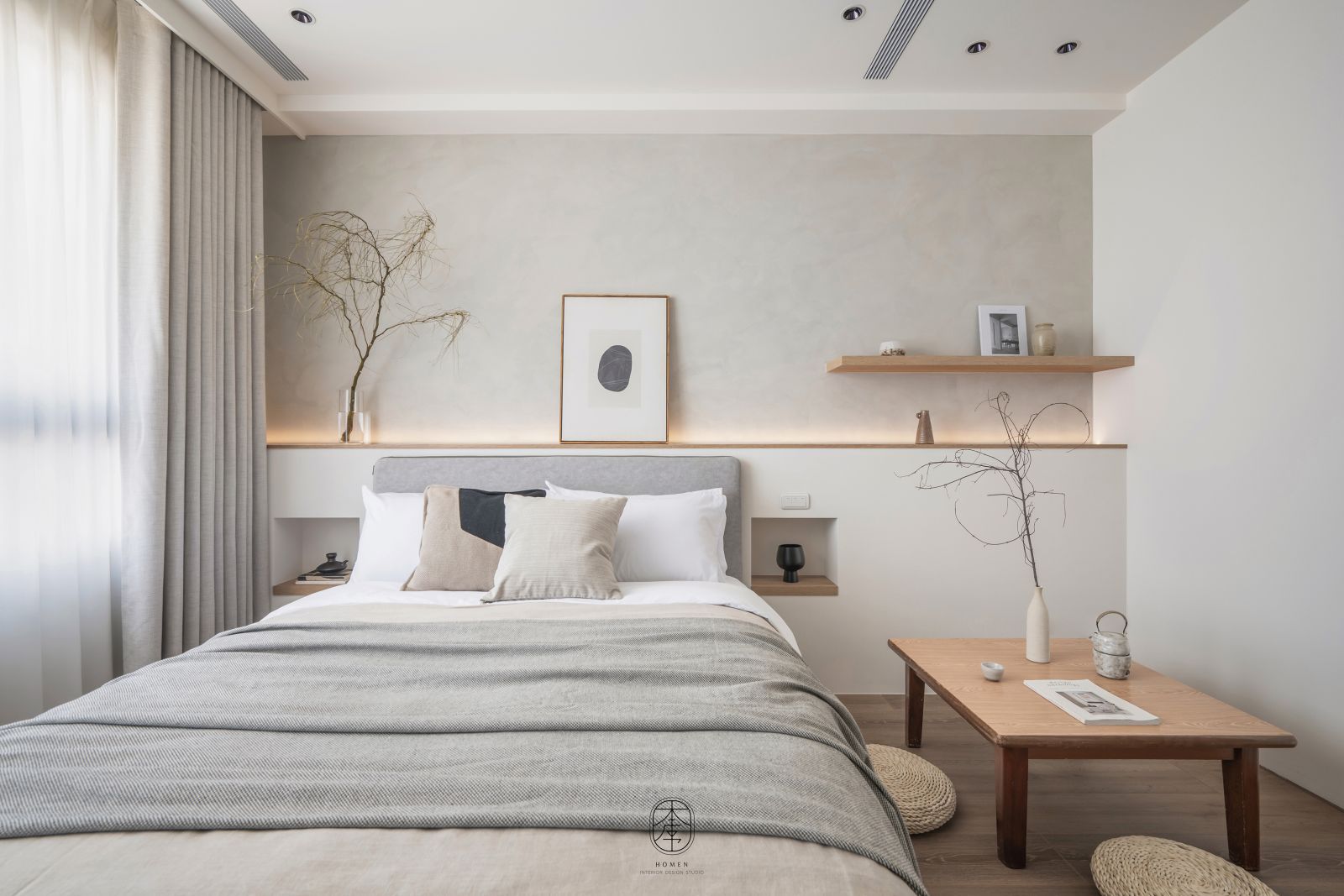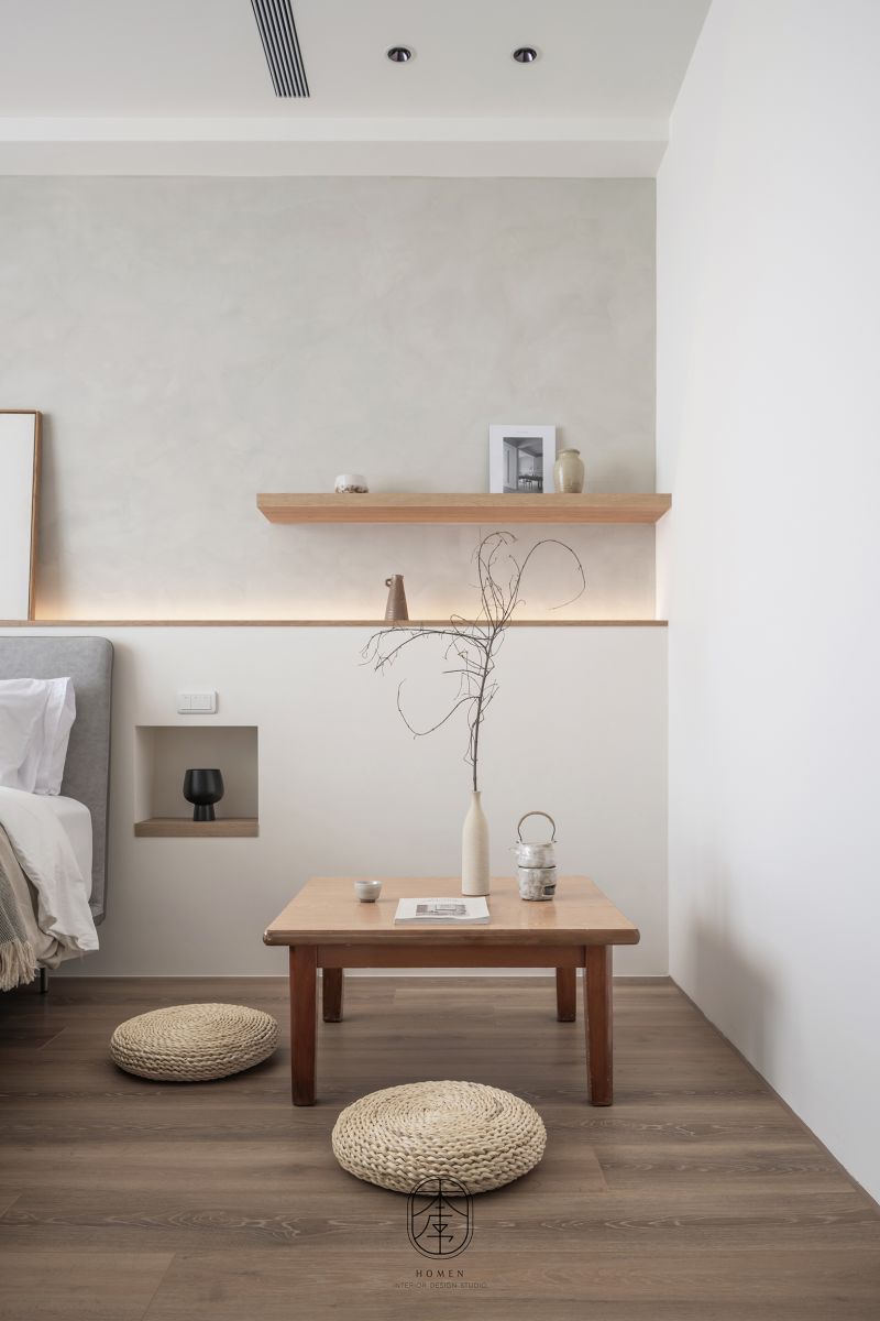 簡約不複雜,木色與白色的比例設計、床頭自然的藝術紋理,就能讓臥室有溫暖、安靜的氛圍,床邊的矮桌與蒲團形成猶如和室的空間,自然生長的枝條與茶具帶出日本儀式感,一進房門就能看到與床頭層板層次的端景。