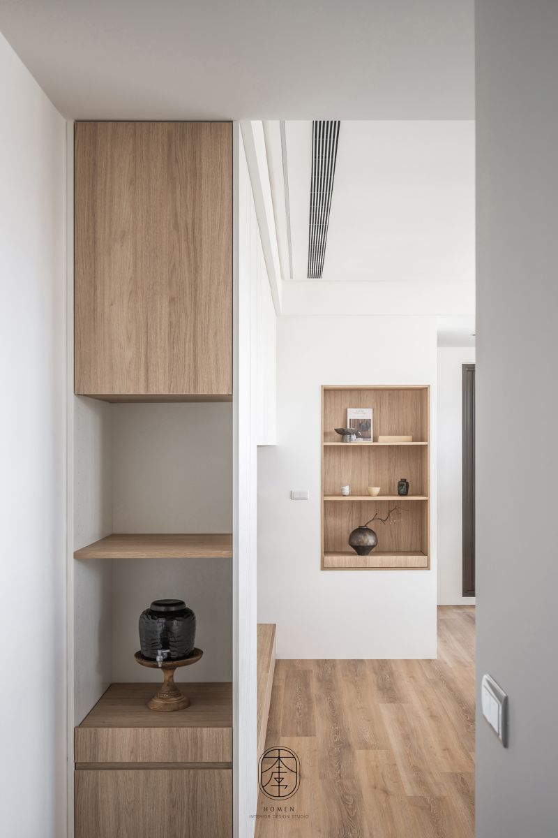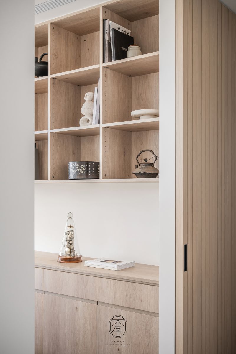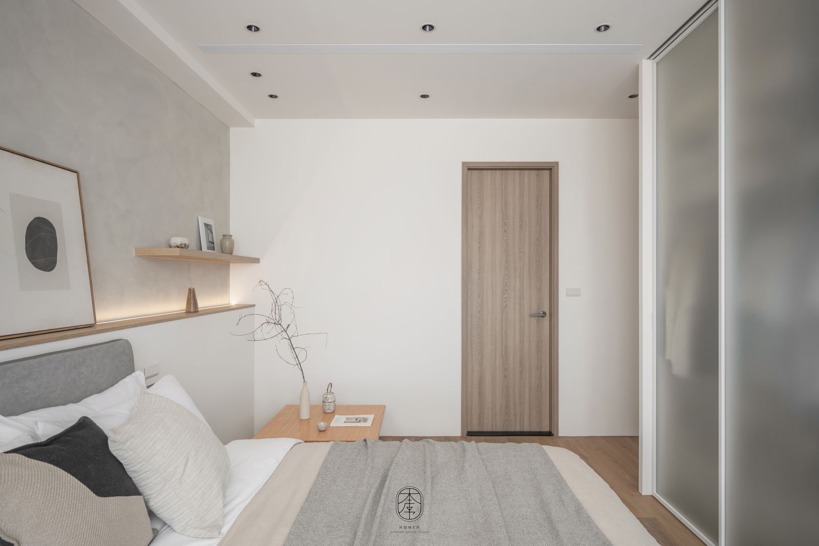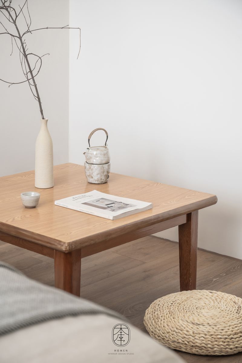 簡約不複雜,木色與白色的比例設計、床頭自然的藝術紋理,就能讓臥室有溫暖、安靜的氛圍,床邊的矮桌與蒲團形成猶如和室的空間,自然生長的枝條與茶具帶出日本儀式感,一進房門就能看到與床頭層板層次的端景。