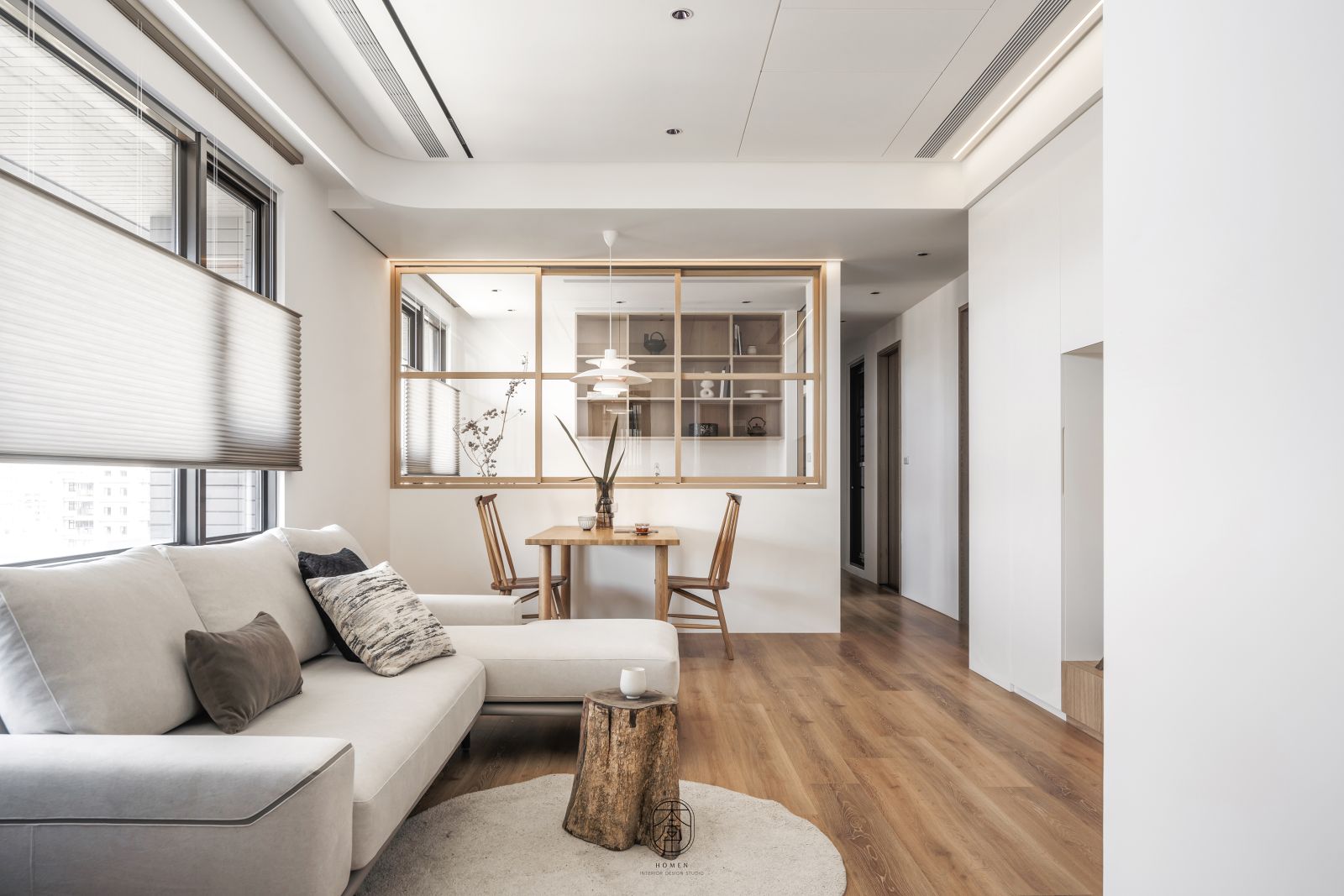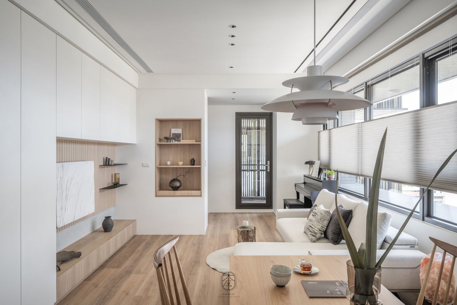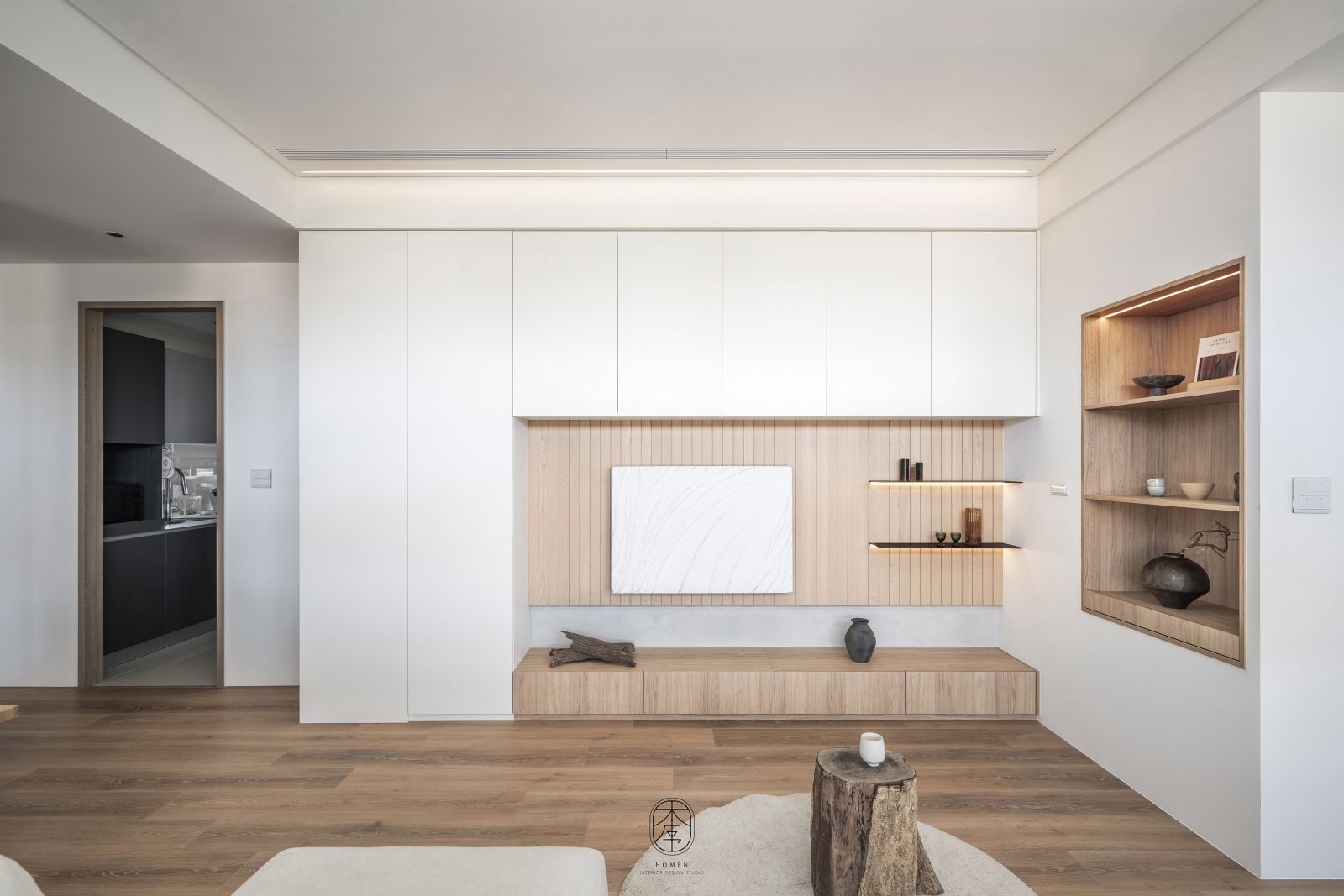 我們深知,要延續這份「白潤」的氣息,佈置必須是融入其中,而非陳列突出。因此,我們謹慎地挑選了帶有天然肌理、色澤原始的家飾物件。例如,選用天然木頭製成的茶几,以其質樸的紋理,巧妙地呼應了空間中的主要建材,強化了回歸自然的氛圍。搭配手工陶瓷或粗麻織品,這些DECO細節為空間帶來溫柔的觸感,讓視覺與心靈都獲得了舒緩。