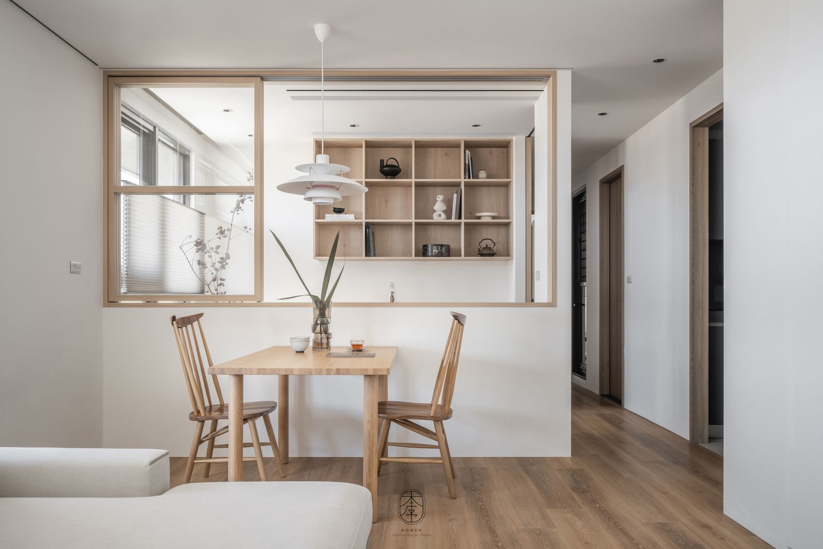 清透的木框玻璃窗,是書房與客餐廳情感流通的橋樑,釋放書房的空間感,也讓吊櫃成為重要端景,再餐桌前景擺上咖色玻璃花瓶搭配流線長型葉植,維持穿透感並增加生命力,品一杯茶、閱讀自己喜歡的書籍,餐桌也是陶冶心靈的地方。