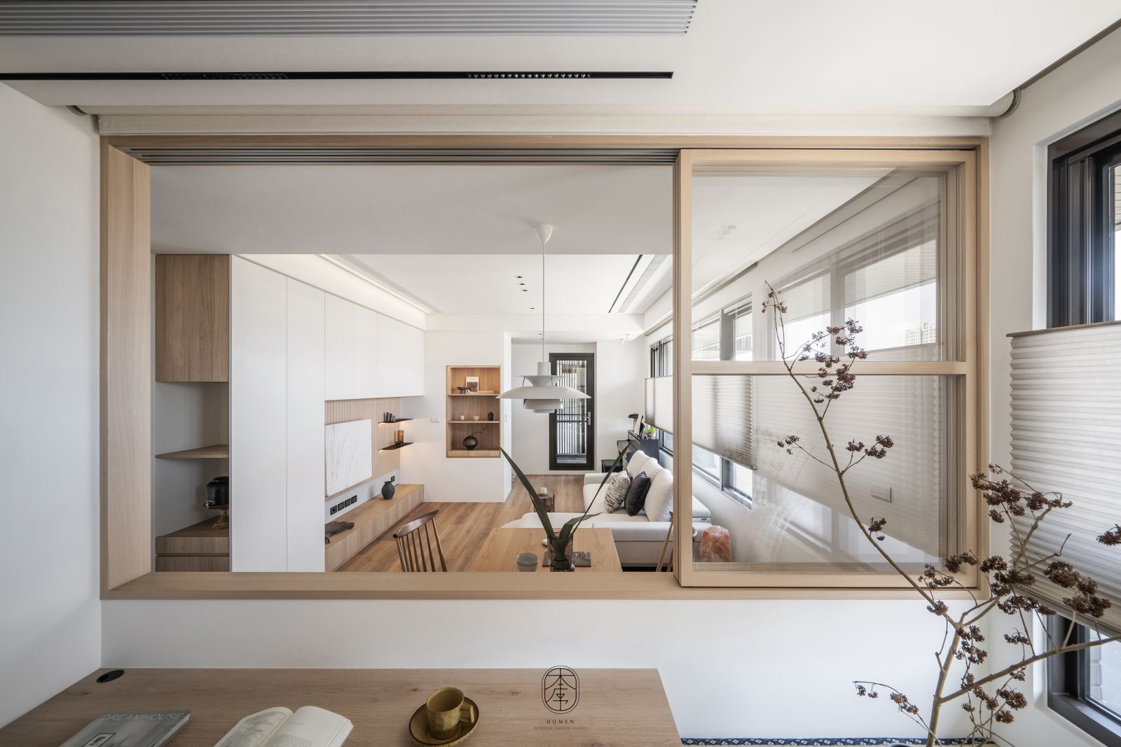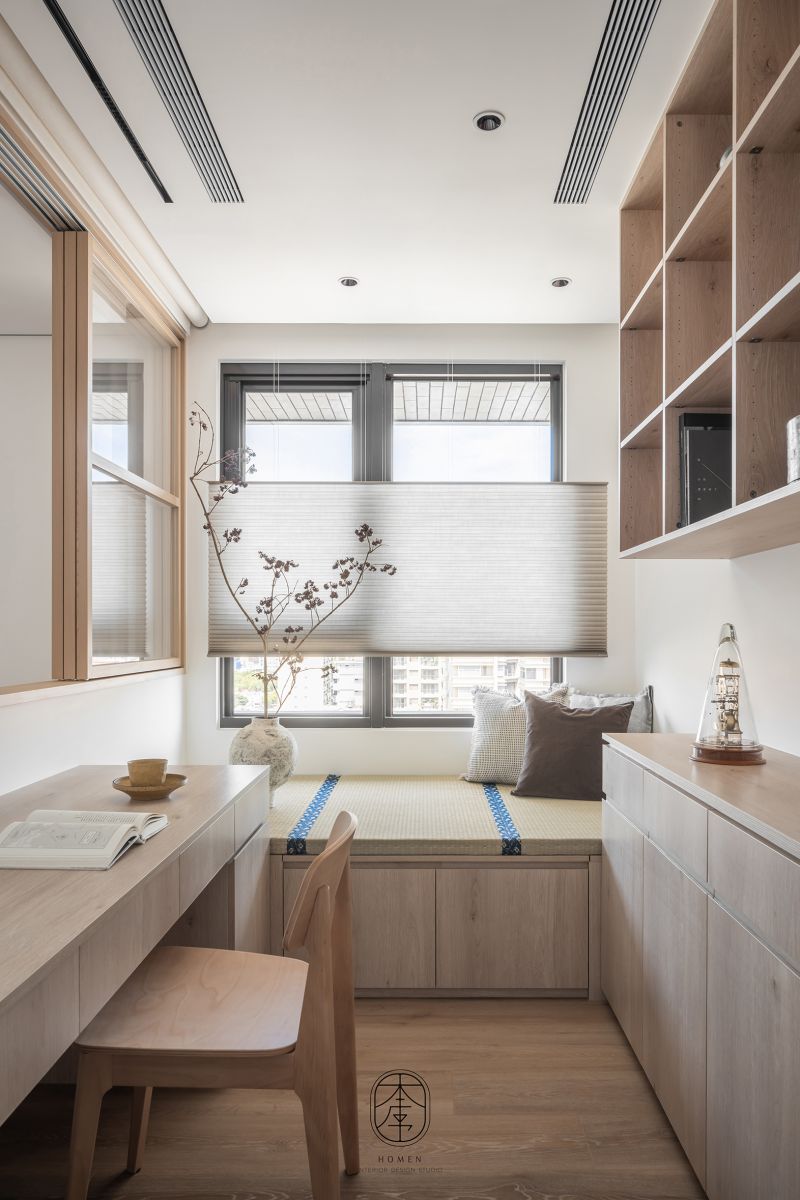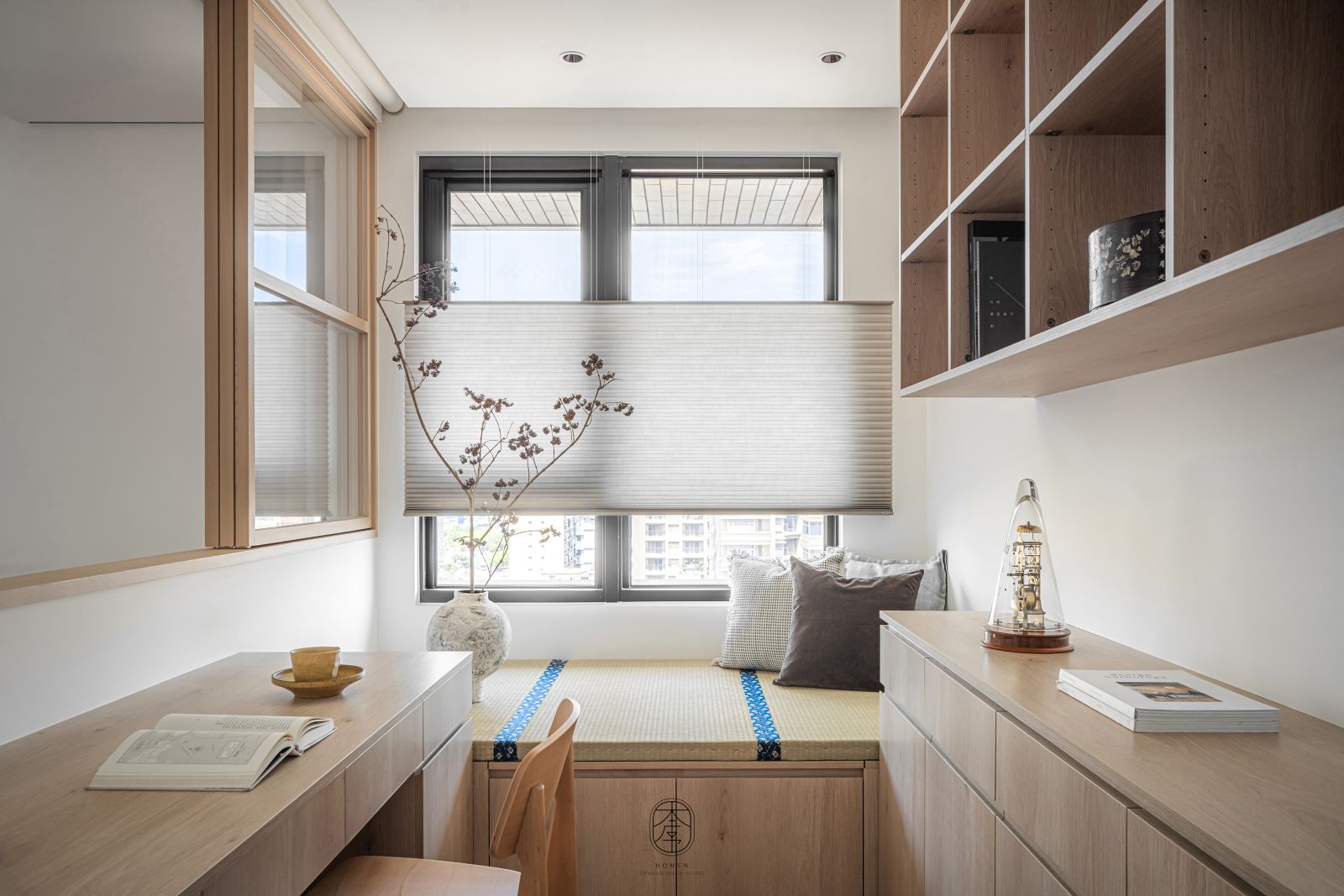設計師透過極簡的線條美學,搭配精選的櫃體色澤,確立了空間沉靜的日式基調。臥榻區的設計,更是整個家回歸內在的私密角落:鋪設的榻榻米,不僅增添了自然的溫度,更營造出一種邀請人慢下來、品味當下的氛圍。