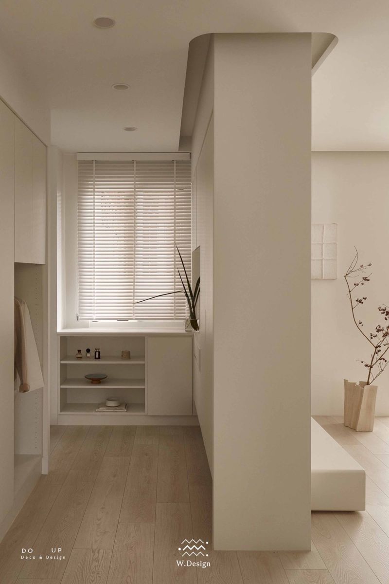 玄關是回家與外出的儀式感,也是清潔心靈很重要的地方,香氛蠟燭的氣味、擺設挑選喜愛的香水,都是不可省略的環節。檯面清透的玻璃花瓶與流線的葉片帶給人輕省無壓力又自在的氛圍,是人所嚮往那自由無束的生活樣貌,這也是軟裝師在空間風格佈置時會重點考慮的細節。