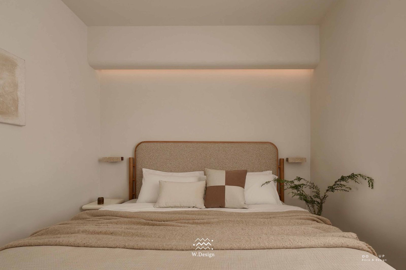 臥室空間室內設計師用精緻的弧型線條與間接照明,為空間帶來溫潤質感,再以軟裝壁燈、床頭家具搭配,在空間有限下仍然輕鬆營造出溫暖氛圍。橘咖色的深色點綴與綠植活化空間,讓寧靜之下也有生機,這便是居家佈置的巧思。