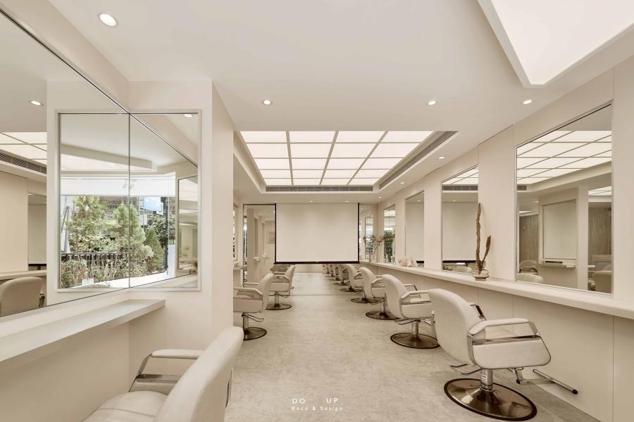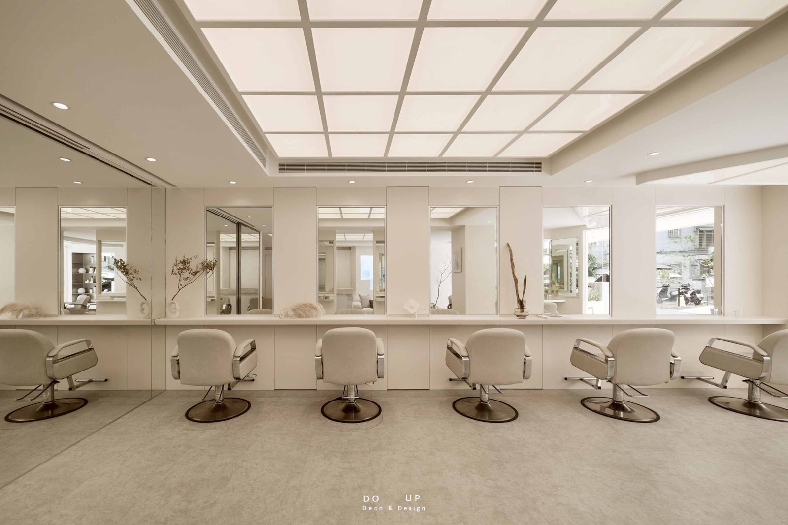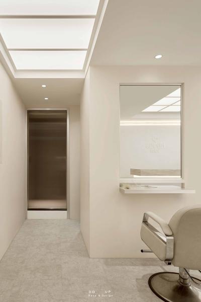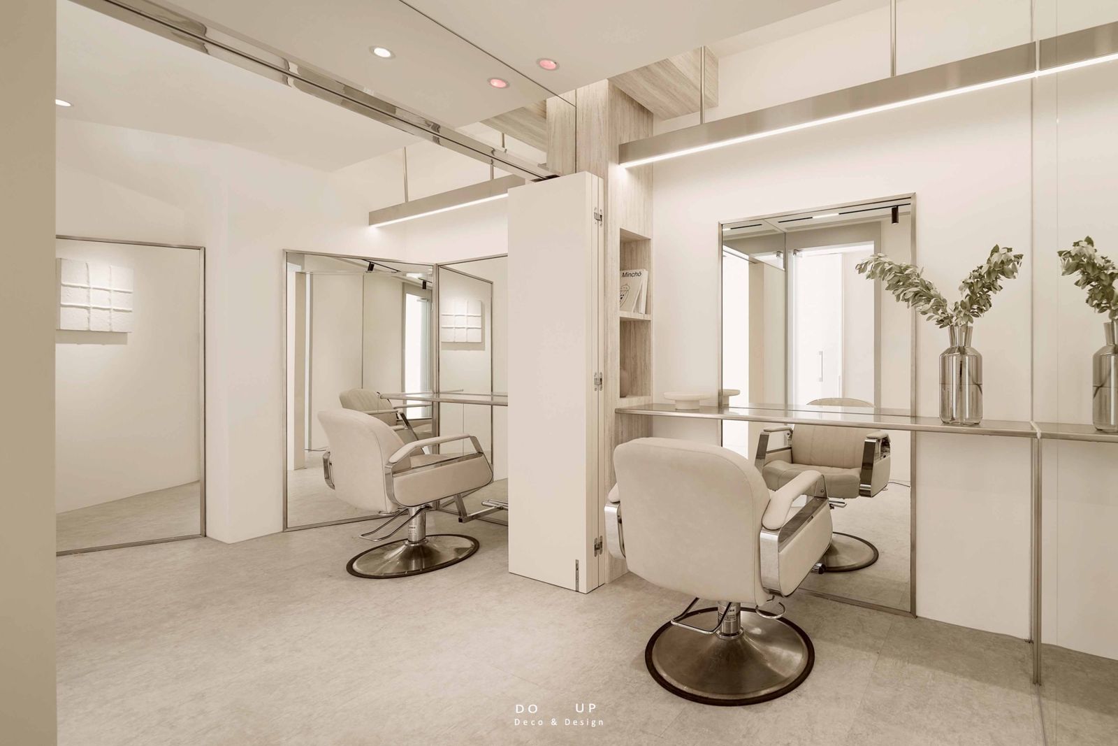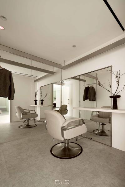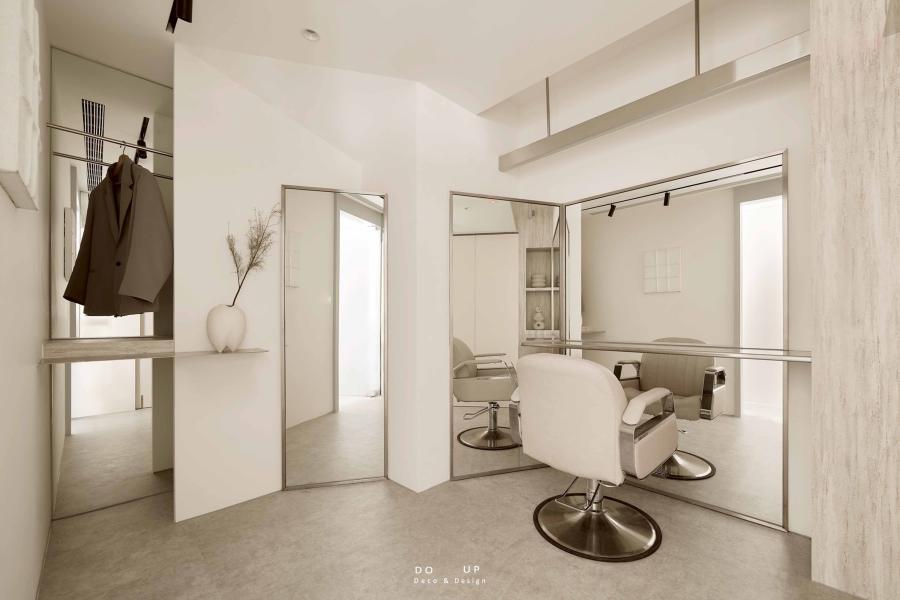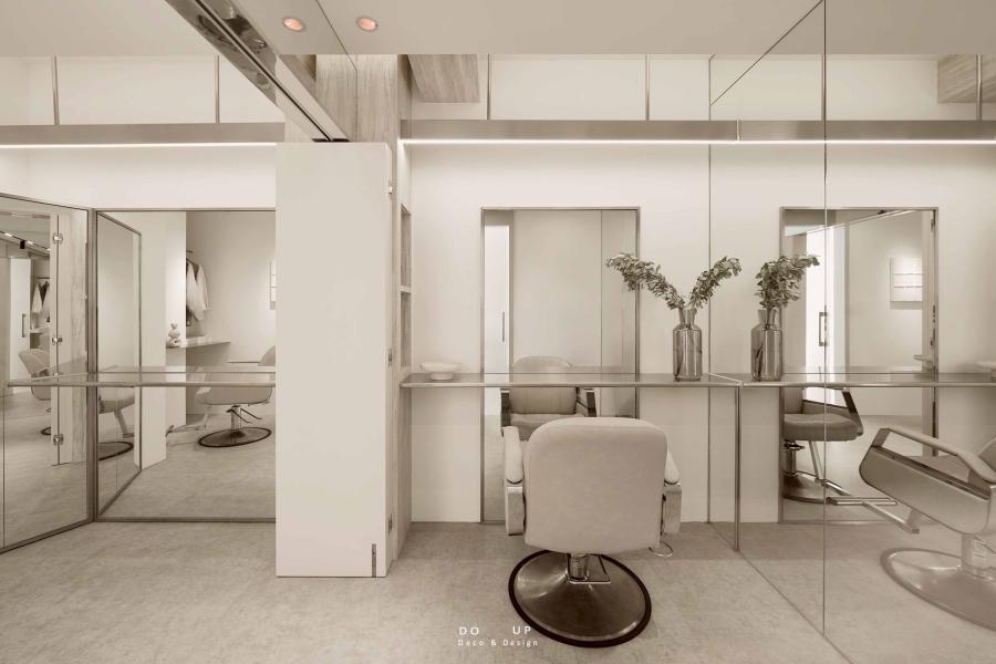 這裡的每一處細節都展現了韓系美學中對「光影」的極致追求。銀色的不鏽鋼層板與專業美髮椅,象徵著工藝上的嚴謹與精準;而溫潤的淺米色地坪則包容了這份冷冽。透過專業的擺拍佈置,空間中不再只有冰冷的機具,更多了份人文氣息與時尚張力。