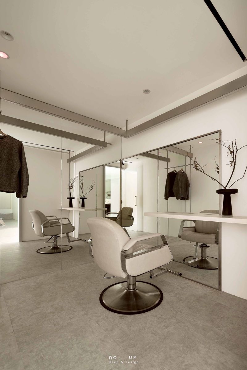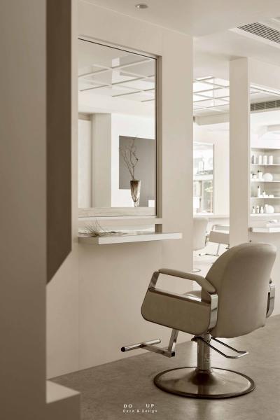 在客人的視線所及之處,DO UP 擺拍團隊 巧妙地運用了自然物件進行擺拍佈置。在俐落的銀色平台中,可以看見隨性延伸的枯枝藝術與造型獨特的陶瓷花器,這些富有生命力的線條與空間中的幾何光影、鏡面切割形成了完美的柔化。這不僅是視覺上的裝飾,更是在引導客人的情緒,讓客人在等待變髮的過程中,能透過這些細緻的佈置獲得心靈的平靜。