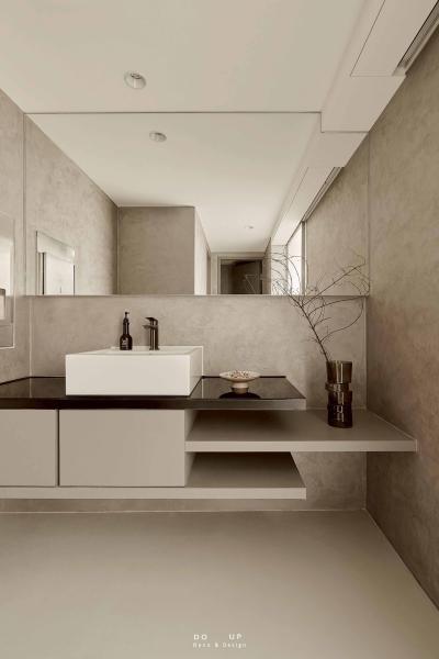 美學的完整度,往往取決於那些最容易被忽略的角落。步入衛浴空間,米色藝術塗料與黑色檯面構築出洗鍊的基調。DO UP 擺拍團隊 在流理台的擺拍佈置上展現了極致的細節控。選用黑色透明質感的層次感花瓶,搭配輕盈的枯枝,與簡約的洗手乳瓶身相互呼應。這份點綴不僅提升了空間的層次感,更傳達出 HEARTS TAIPEI對於品質的不妥協——即便是洗手檯的一隅,也是整體視覺饗宴的一部分。